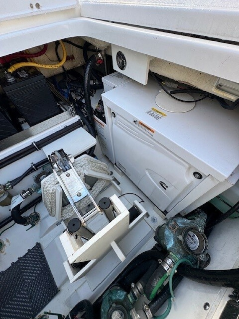 - Flush Mounted Integral Anchor Locker with Fiberglass Lid including: Vertical Anchor Windlass with Switch at Helm and Remote at Anchor Locker, 316L Stainless Steel through Stem Anchor Roller with 8" Mooring Cleat, Chain Binder, 35lb Stainless Steel Plow Style Anchor, Self-Righting Swivel, 320' Rode (5/8" 8 Plait Including 20' of G4 Chain), Fresh and Raw Water Quick Connect Fittings and a LED Courtesy Light