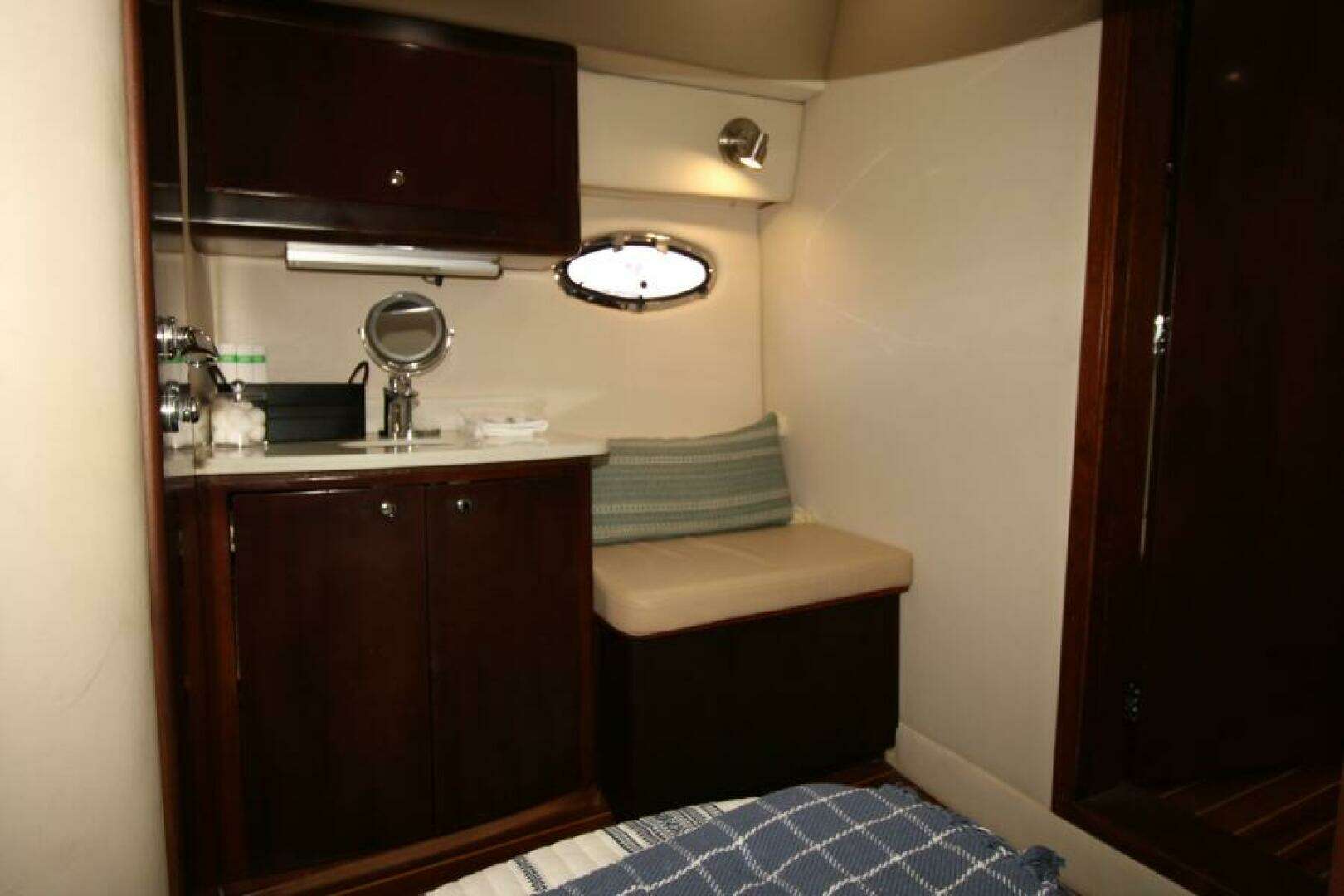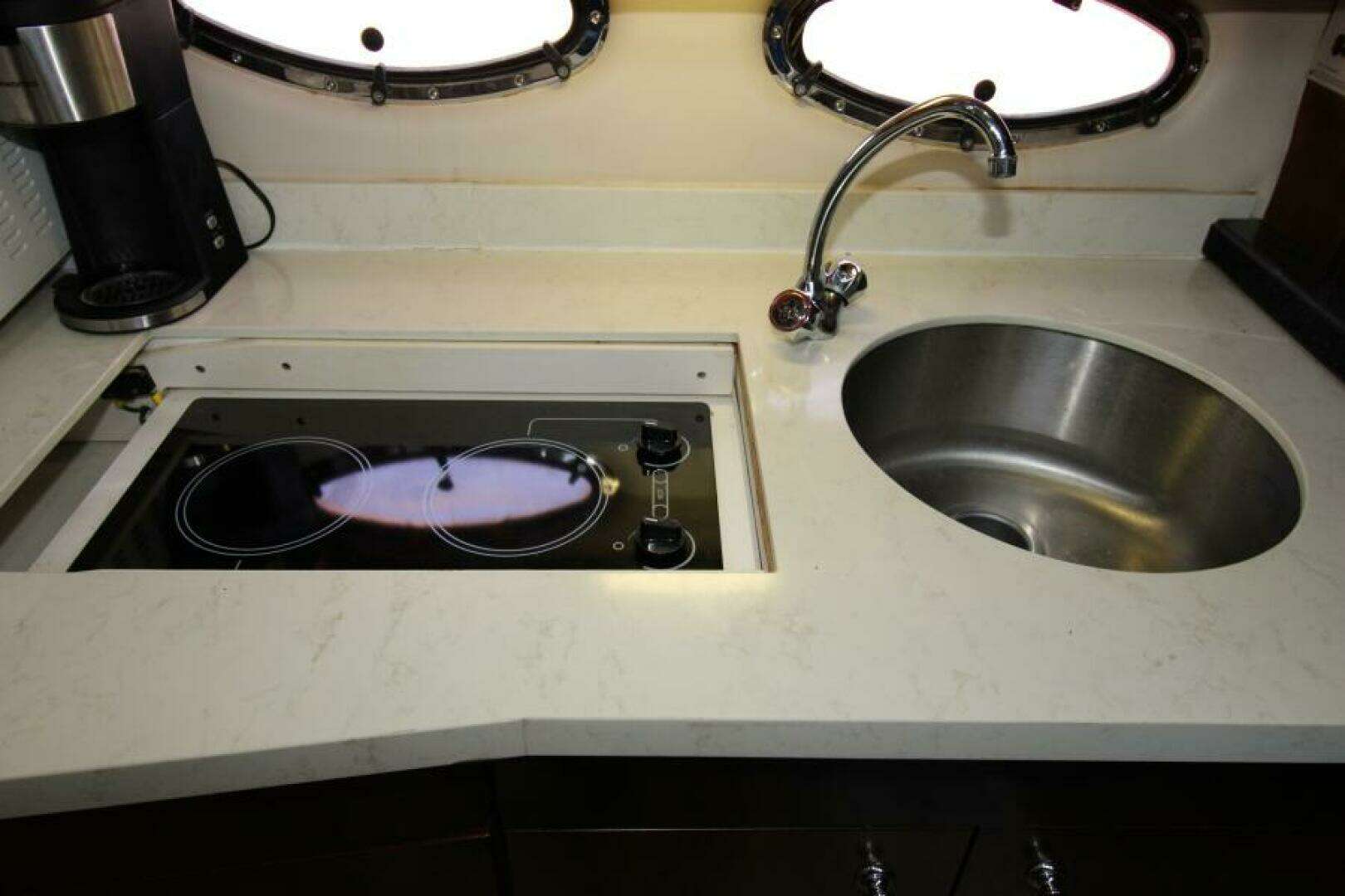 On deck, a large U-shaped seating arrangement faces the helm and driver. The helm is extra wide for two-person seating, and the aft cockpit features facing bench seats, a refrigerator and sink. Alternate engine access is gained via a walk-down ladder beneath the aft bench seat. With access on the swim platform the transom storage provides plenty of room for fenders, dock lines and cleaning supplies. Forward on the bow is the anchor and windlass, and the sun pad. Below, the forward stateroom offers an oversized berth with a real innerspring mattress that is hinged for easy access to a large storage area beneath. There are also two full-size storage drawers and a large cedar-lined hanging locker. An LG flat screen TV is on the starboard side. Above the berth is a recessed bookshelf. Both staterooms have hardwood pocket doors, not curtains, for real privacy. And both have their own private heads. The wide-open main salon of the 4260 features a nine-foot LeatherCrest sofa that is deep and comfortable. The stereo is a Fusion with remote head in the cockpit with speakers. The beautifully proportioned galley features a large, curved expanse of Corian counter surface with plenty of easy-access, roll-out draws and bin storage below. A side-by-side refrigerator / freezer (new 2021), microwave, coffee maker and hidden two-burner stove are all standard. Additional storage and the TV can be viewed from the salon area. The 4260 galley even provides dedicated storage for the dishes.