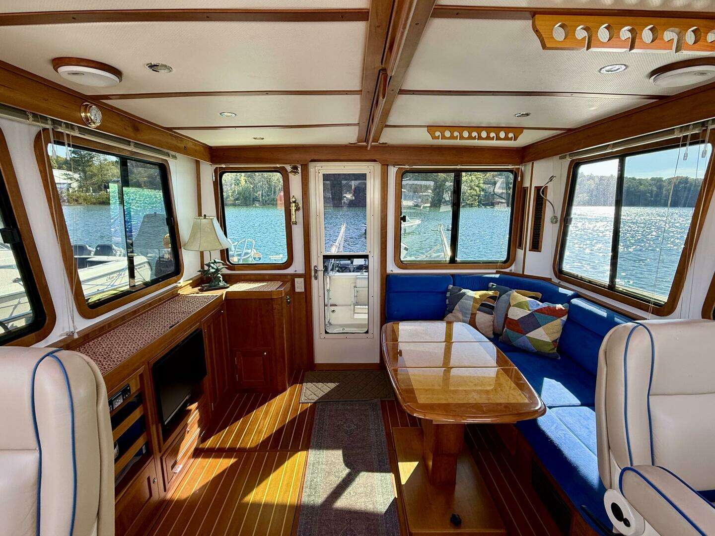 A very desirable feature is the sliding helm door (with built-in sliding screen door) to make docking and access forward much more convenient. All side and rear windows are also opening, along with two opening deck hatches, to offer exceptional ventilation. This area can also be closed up and cooled/heated efficiently when desired, thanks to the reverse-cycle air conditioning. Valance lighting and numerous lamps create a warm ambiance at night.
