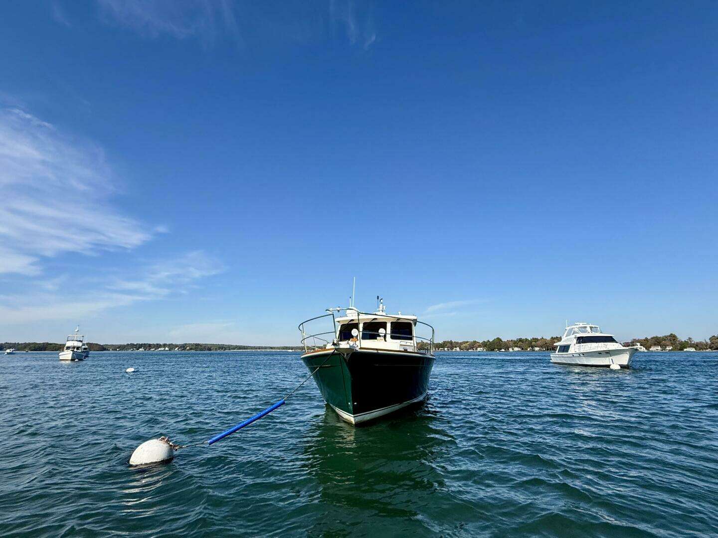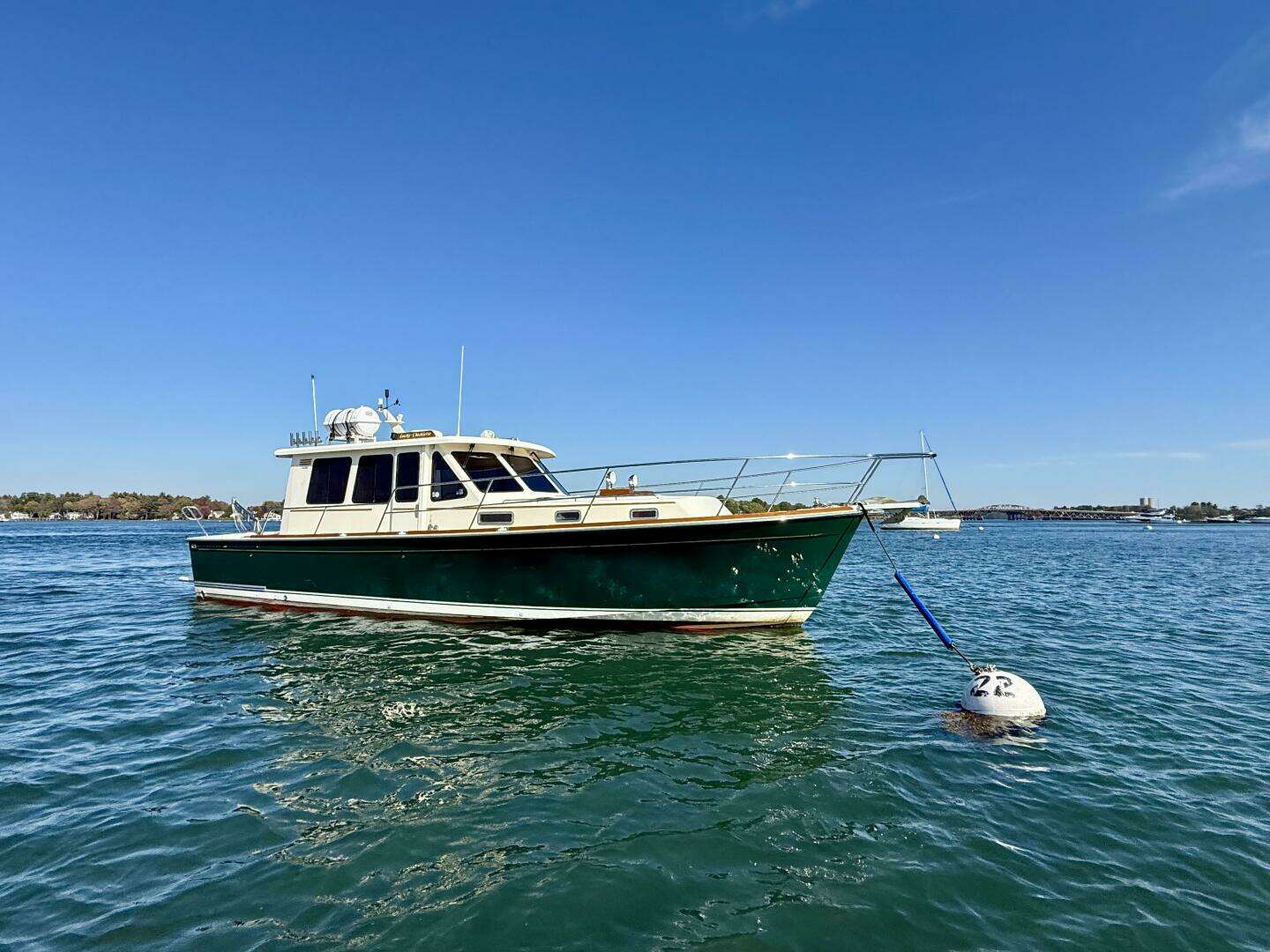 Fiberglass deep vee hull with vacuum bagged closed cell foam coring in the bottom and topsides. The hull was Awl gripped Jade Green with a White/Jade Green/White boot stripe and gold cove stripe in 2012. The bottom is finished with a red hard epoxy anti-fouling.
