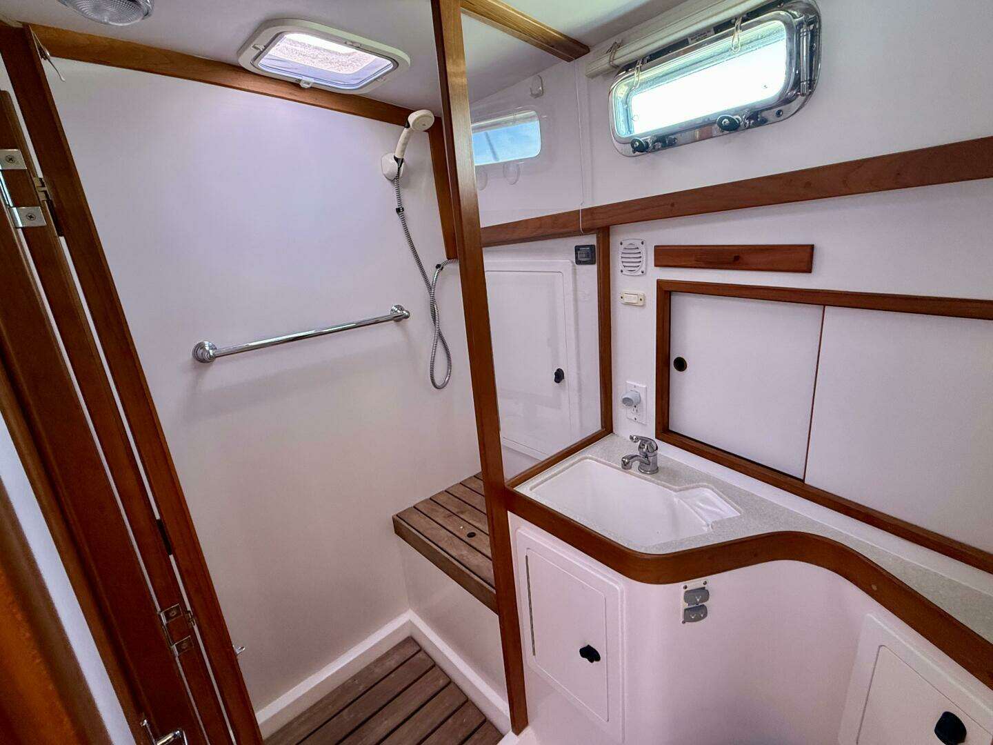 Next aft to port is the Head with separate stall shower compartment with private access from owner's cabin as well as a second door from the passageway, the head is nicely finished with Corian counters, stainless sink, cherry trim, and a freshwater flush electric toilet. The shower stall is fitted with a bench seat and storage outboard.