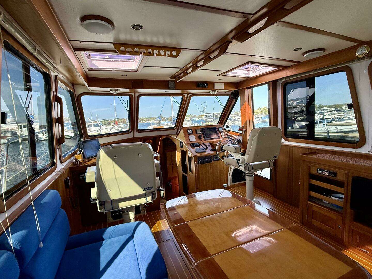 The main salon offers a central, high-visibility area for lounging and operating the boat in any weather condition. To port is an L-shaped settee, covered in Ultrasuede, and an expansive built-in chart table/counter space forward with ample storage under. A focal point is the beautiful expandable high/low salon table with bird's-eye maple inlay. The settee can also extend to convert to a large double berth. To starboard is an entertainment center with bookshelves, additional lockers, custom bar storage and helm station forward. There are Stidd chairs forward each side for helm and navigator; all upholstered in Ultra Leather.
