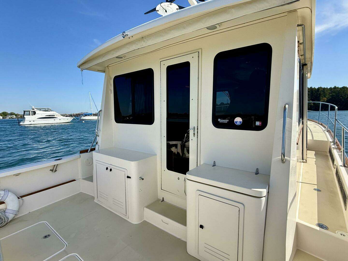 A center-line door access the cockpit with fold up transom seat, transom door. H&C cockpit shower and storage in a cabinet forward and to port and in lazarettes below deck. Steps allow easy access to the wide side decks with double stainless steel safety rails providing ease of access fore and aft. Two additional storage lockers are P&S of the anchor platform.