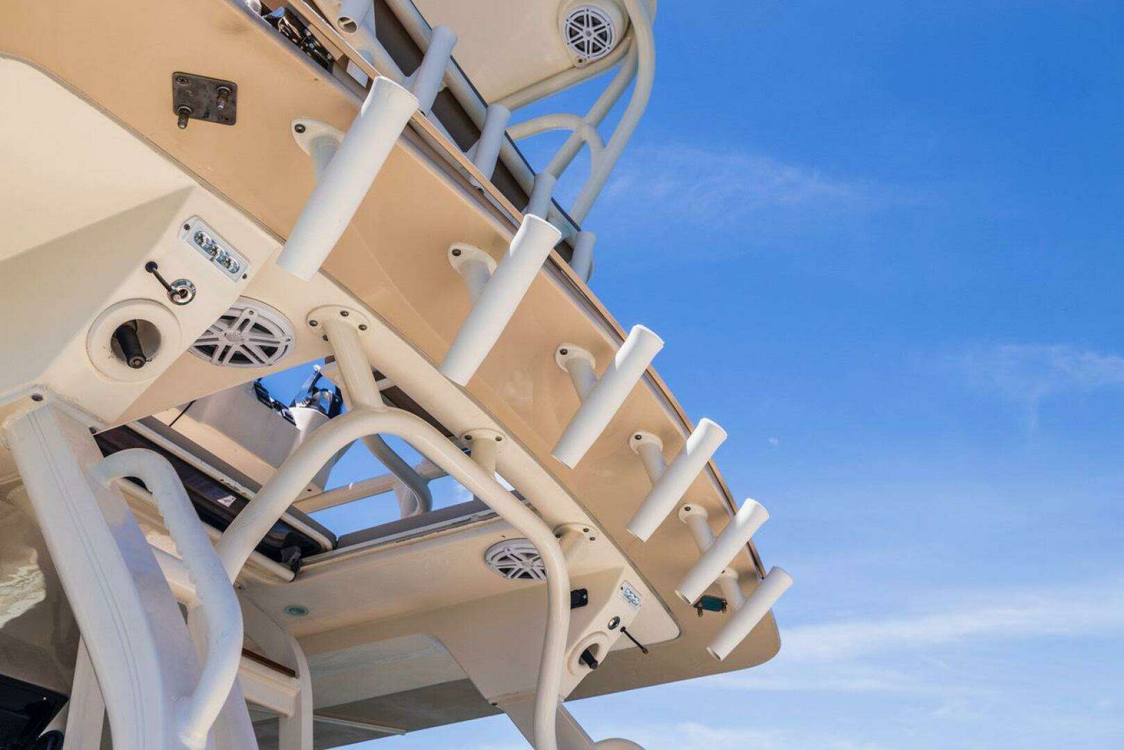 For water access and recreation, the boat features a hydraulic port side beach platform, making it easy to swim, dive, or launch water toys. Offshore anglers will also appreciate the new 22’ carbon fiber Taco outriggers, enhancing the vessel’s fishing capabilities.
