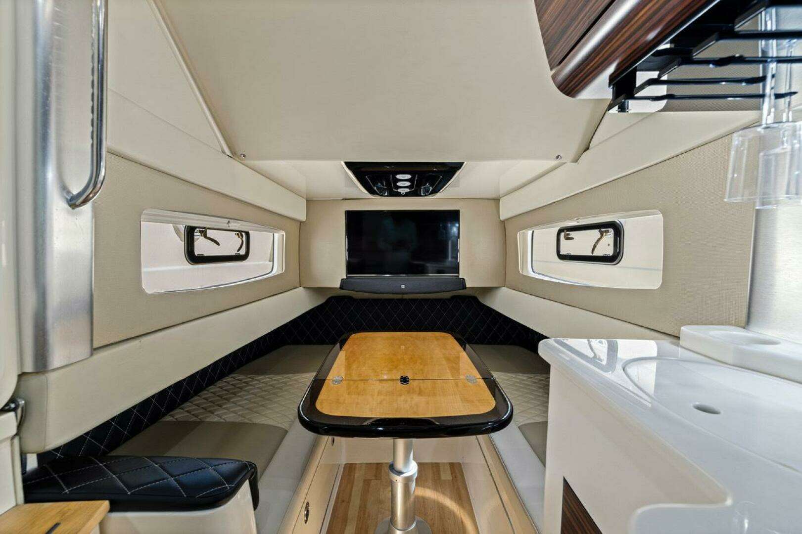 Entertainment is elevated with an upgraded JL Audio sound system paired with a Fusion head unit, delivering premium sound quality throughout the boat.