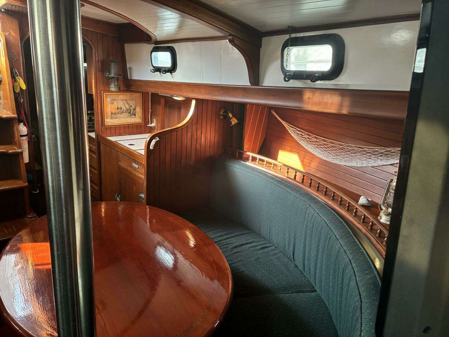 The main salon offers a welcoming living space with settees to port and starboard and a center dining table, creating a natural gathering place for meals, relaxation, or passage planning. The classic interior joinery reflects the craftsmanship typical of cruising sailboats from this era.