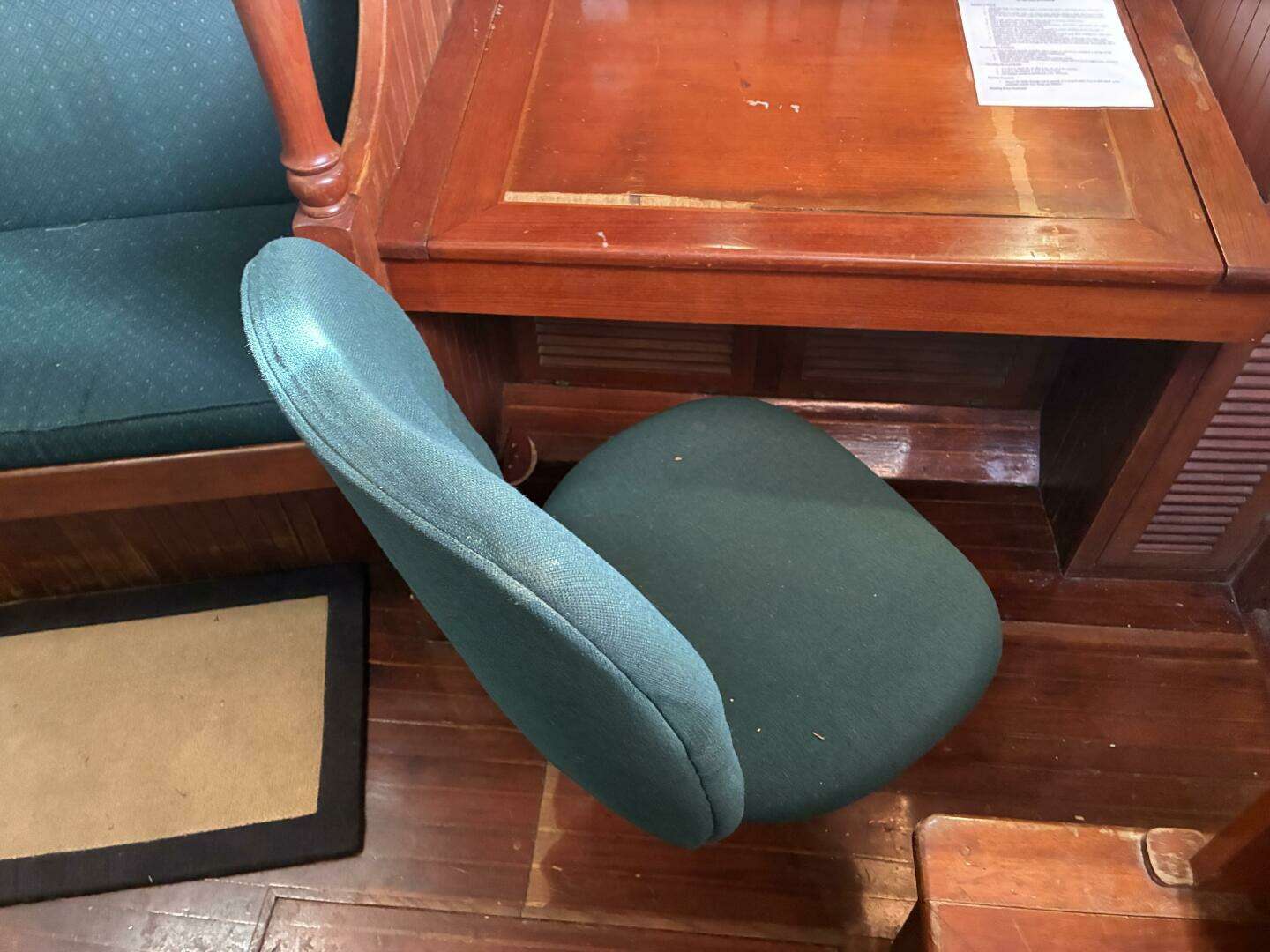 - Nav Station: To Starboard, wood in fair condition with swing nav seat