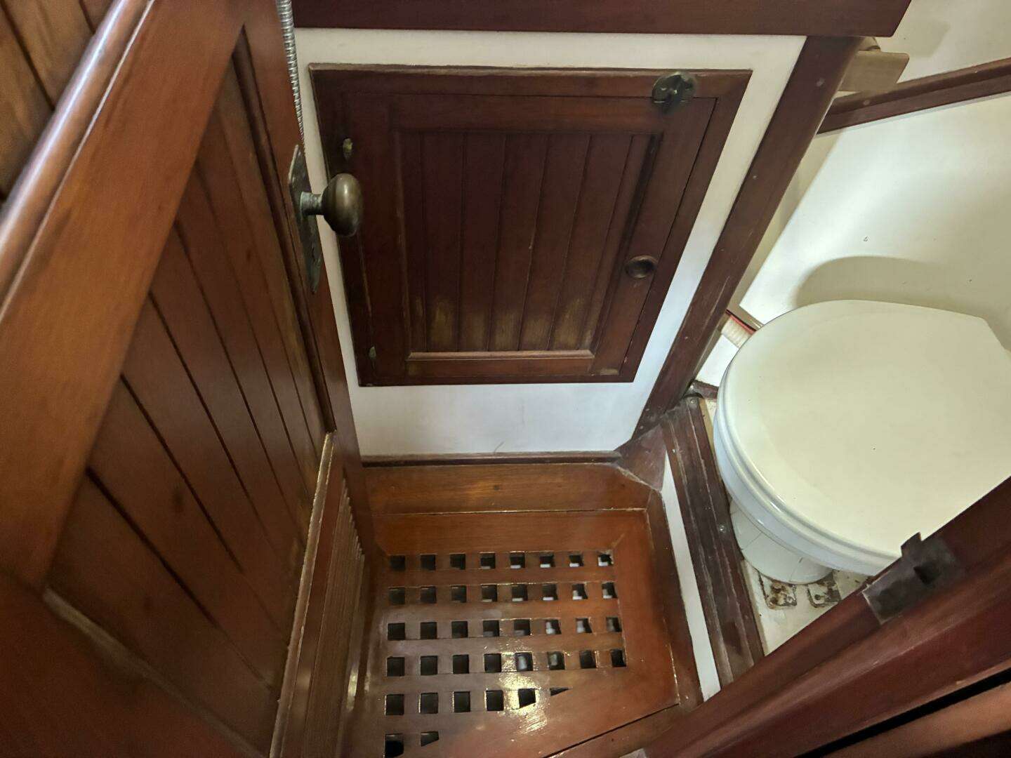 Stepping below through the companionway, Arcadia reveals the warm teak interior that is characteristic of traditional bluewater cruising yachts. Solid wood cabinetry, generous storage spaces, and a practical layout provide the foundation for comfortable life aboard during extended voyages.