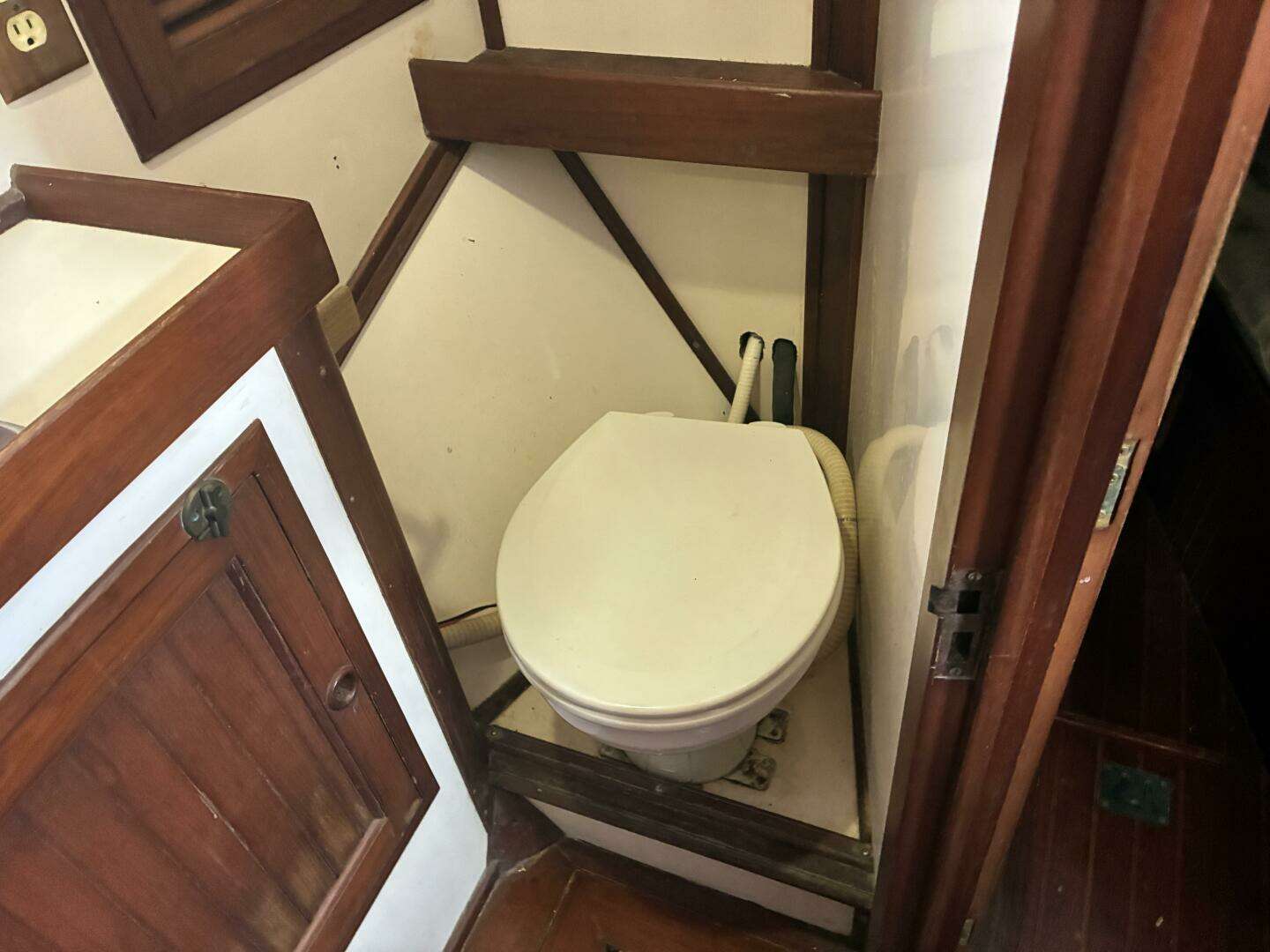 Forward, the guest cabins feature bunks in the forward cabin, and aft of the forward cabin, there is a single berth along with storage for gear and provisions. The nearby head compartment includes a marine toilet, sink, and shower area, providing practical onboard comfort.
