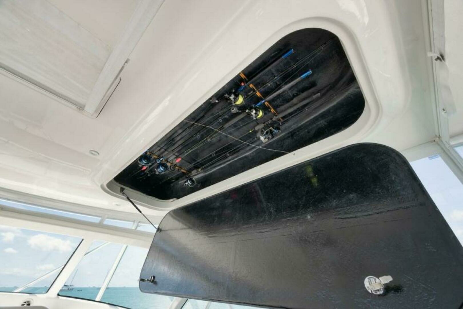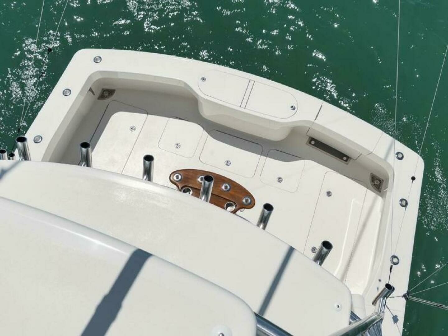 - Tower console with flush mount Garmin monitor, VHF radio, engine controls and joystick