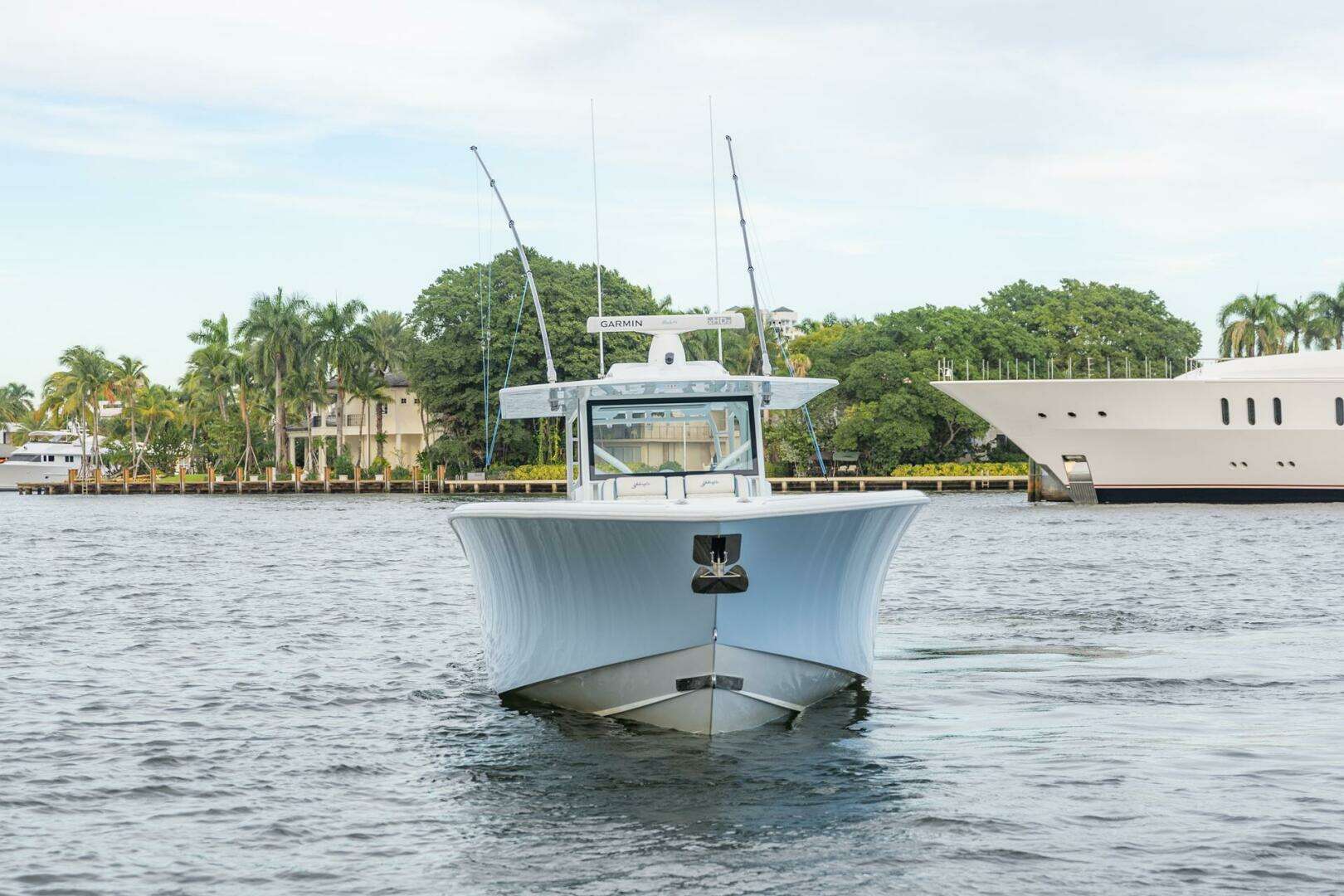 This Custom-Built 42' Yellowfin Yacht Tender 2023 is an absolute rocket—hitting speeds up to 74 mph. She keeps up, to say the least. Loaded with performance and comfort features, she includes a Quick Stabilizer, Frigibar Ice Machinefeeding the fishbox, no bottom paint, Garmin electronics, dual-row seating, Dive Door, Bow Thruster, forward lounge and seating, sink and cooler in the leaning post, double berth, Air Conditioning, and quad Mercury 450Rs with low hours.