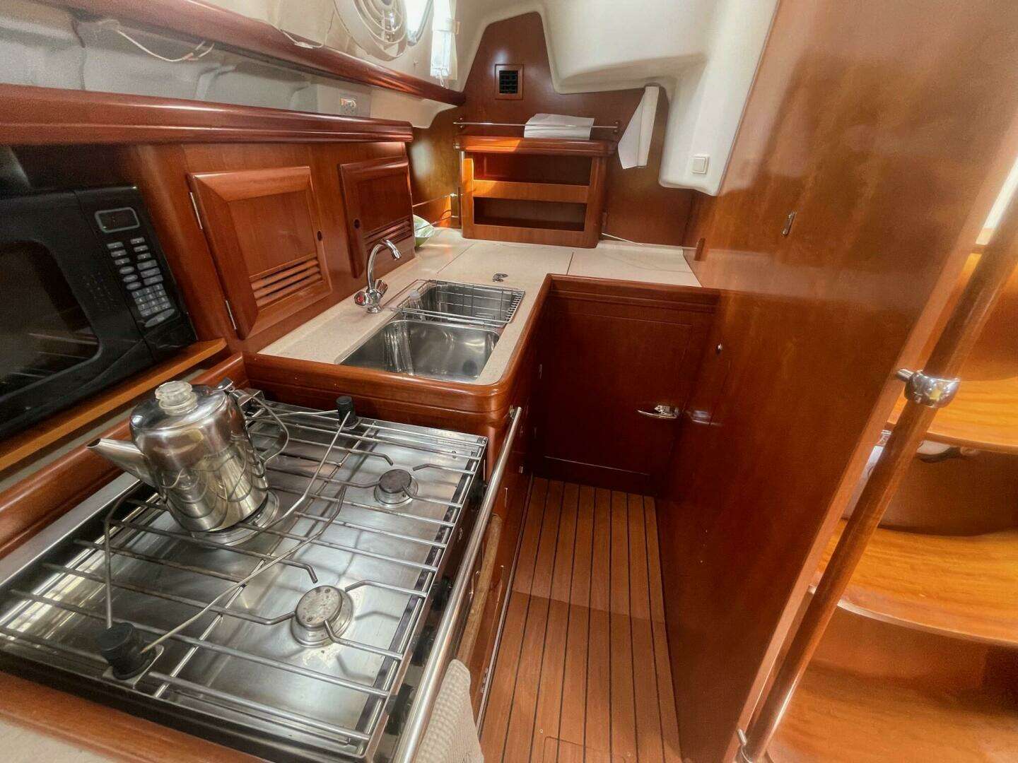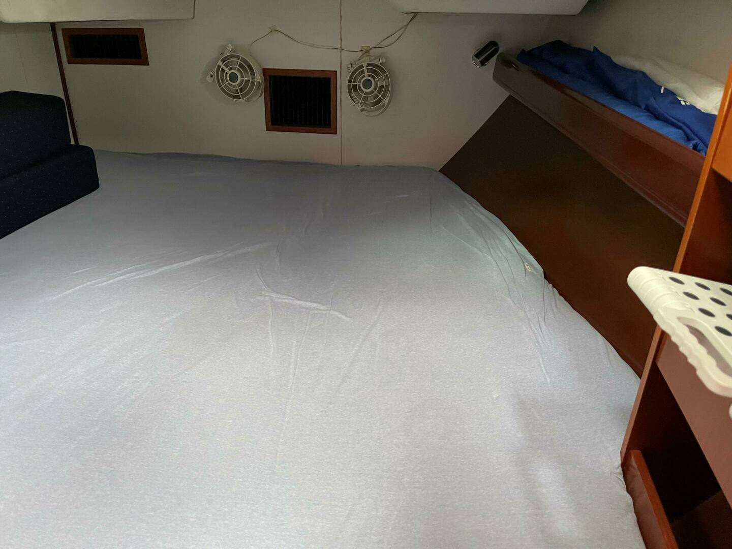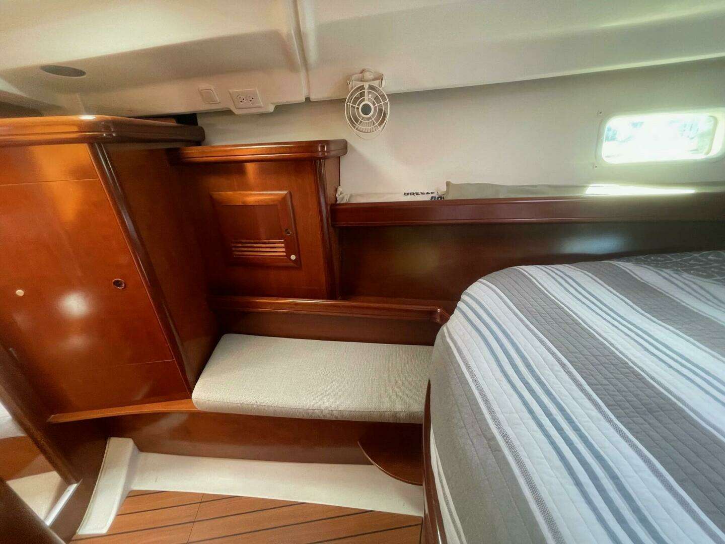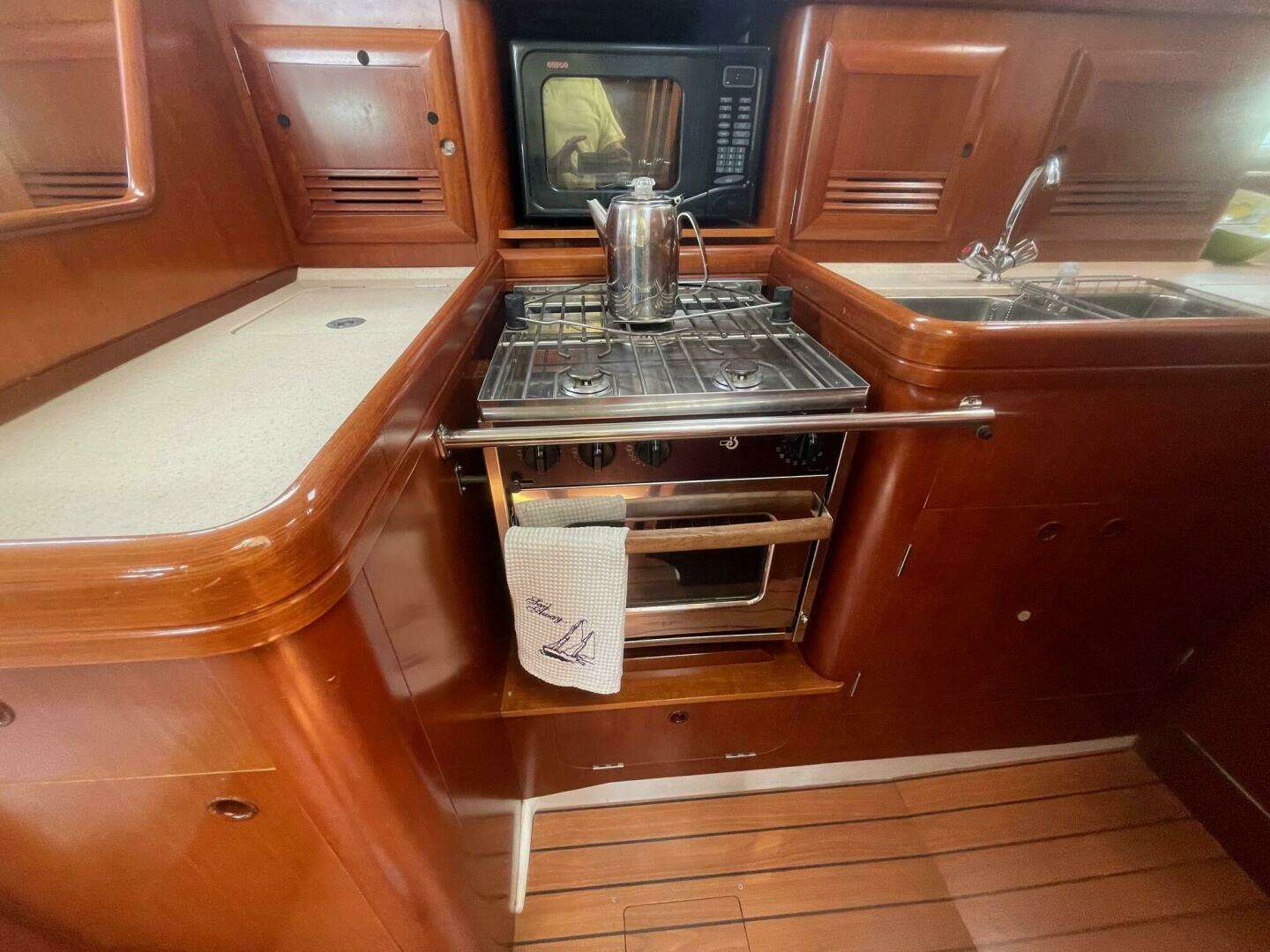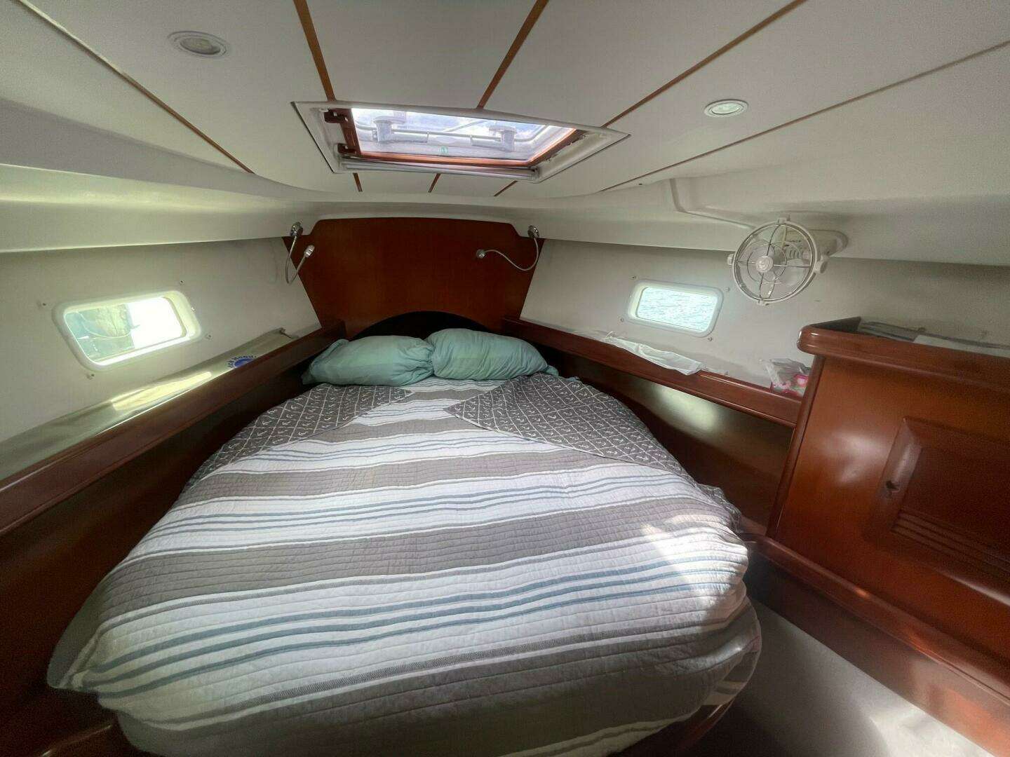 🛋️ Spacious 2-Cabin, 2-Head Layout Below deck, you'll find a bright and airy interior with rich cherry wood finishes and generous headroom. The forward cabin features a large V-berth featuring a custom mattress and en-suite head and shower, perfect for owners who value privacy. Aft, the second cabin offers a roomy double berth and easy access to the second head—ideal for guests or family. The saloon is inviting, with a U-shaped dinette and settee that convert for additional sleeping space, and the galley is fully equipped for extended cruising. Her Sea Frost refrigeration with separate freezer provide for more than adequate means to keep provisions fresh. Her Beneteau 3-burner cooktop with oven and Origo microwave are well laid out for your chef to prepare meals in a safe environment while underway or on the hook. Two reverse cycle air conditioning units provide cooling in the summer and heating in the cooler months keeping you and your guests comfortable.