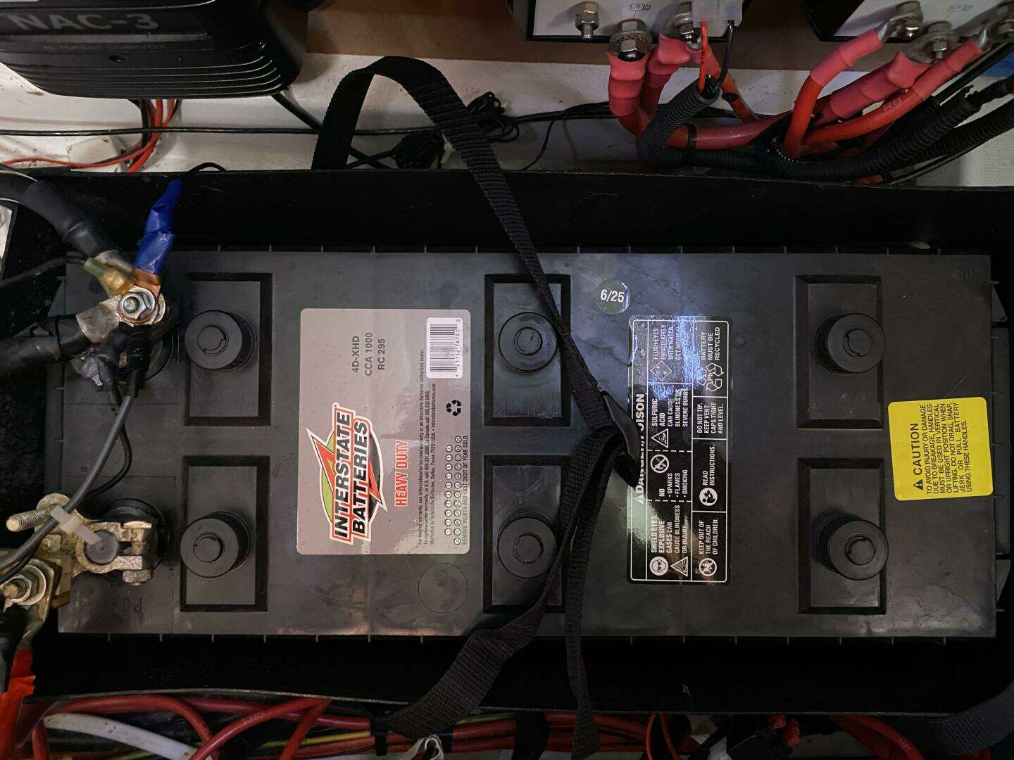 - Batteries: 3 Interstate House batteries (3 x 4D-XHD, class 8) [new 2025], 1 forward bow-thruster/windlass battery, 1 engine battery