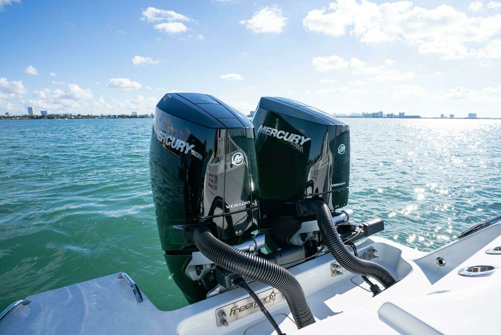This 2023 43’ Freeman Boatworks is an elite offshore performer finished in the highly desirable Whisper Gray. Powered by quad Mercury V10 400s with 620 hours, paired with factory Mercury electric steering and Mercury Joystick Piloting, this boat delivers effortless control, precision docking, and wo