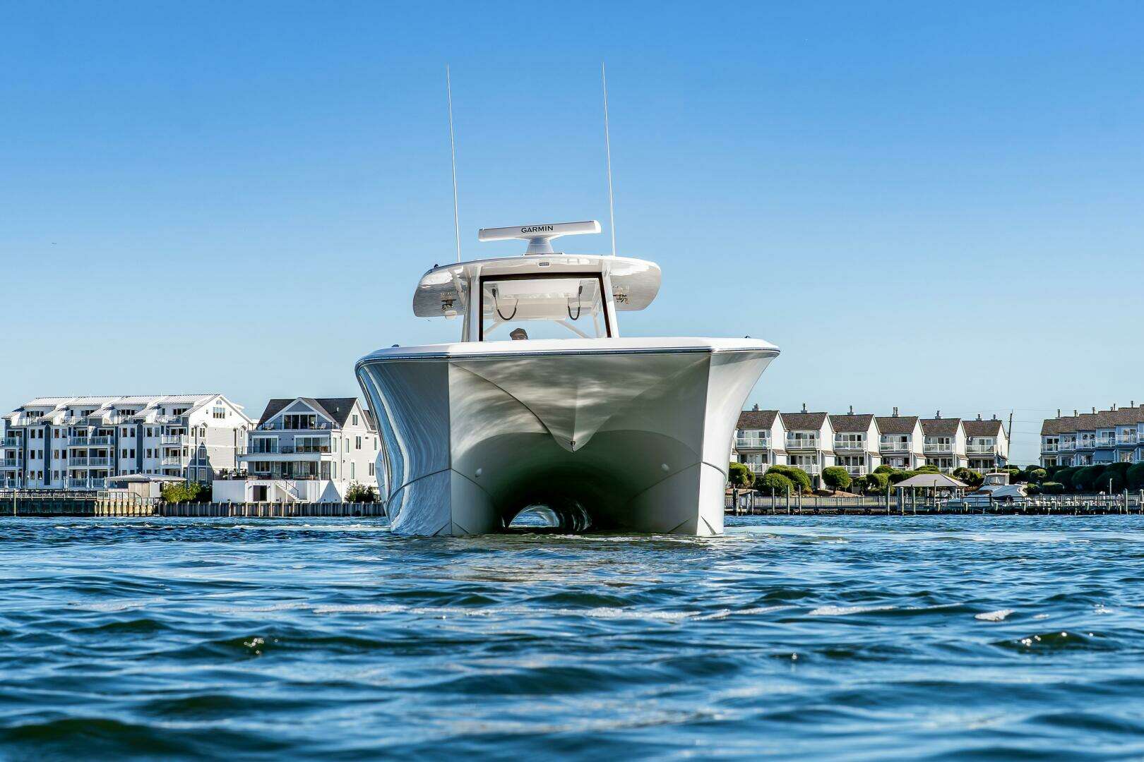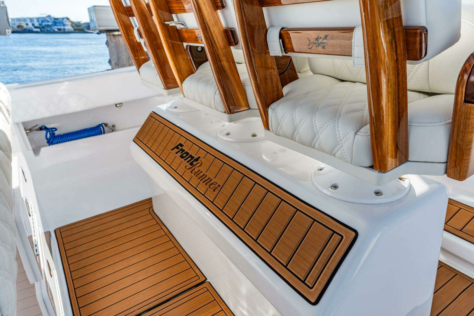 Following the success of Front Runner’s 37 Cat, the new 43’ model raises the bar for offshore performance and fishability. With a 12’4” beam, dual-row helm seating, large transom livewell, and two in-deck livewells, this platform was built for serious fishing and versatile family fun. Its stepped hull, lifting strakes, and flared bow deliver a smooth, dry ride with exceptional stability in any condition.