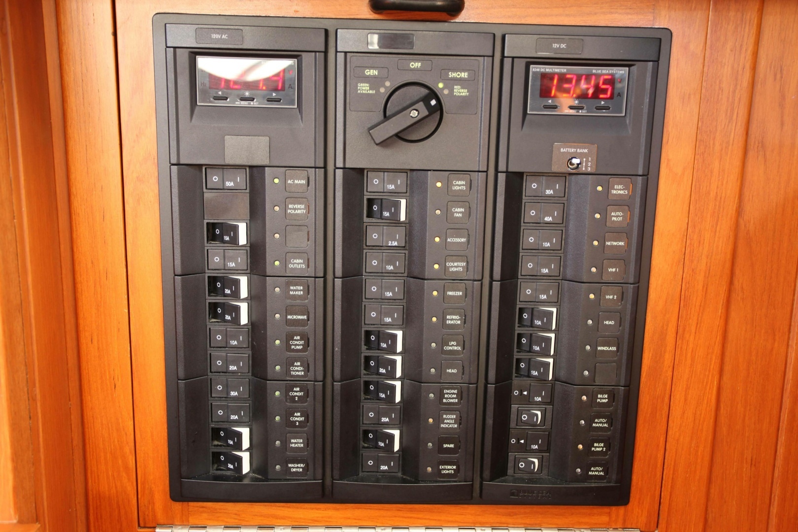 Rigged as a masthead cutter, the vessel carries anodized aluminum spars, stainless wire standing rigging, in‑boom mainsail roller furling, and roller furling on both headsails. Auxiliary power is supplied by an inboard diesel engine with a direct‑drive shaft, supported by a single 120/240V diesel generator.