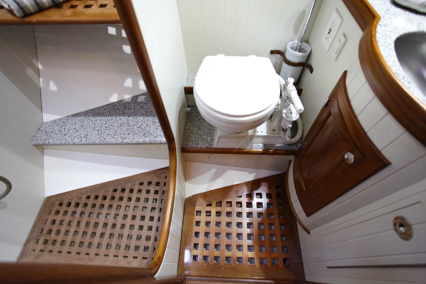 Moving aft from the salon and down two steps is a private aft cabin, featuring a large double berth to starboard and a private head to port, creating an ideal owner’s stateroom arrangement.