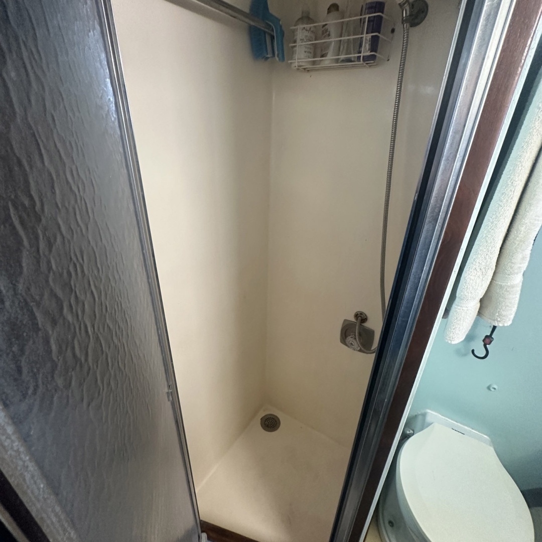 Starting forward is the guest stateroom with a V-Berth and head under cushion seat between the berths. There's a wash basin, plenty of storage and a closet. Teak and Holly floors in the staterooms and salon. Going aft on the port side is the galley with a full-size refrigerator with ice maker and princess stove. To starboard is a full head with a stall shower. Further aft to starboard is the master stateroom with twin beds that convert to one king size with insert, closet, security locker and plenty of storage. Moving up to the salon on the starboard side is an L-Shaped couch. There is also storage underneath. There is a chair to port with a table and wet bar with ice maker. The salon is large for a 43 convertible.