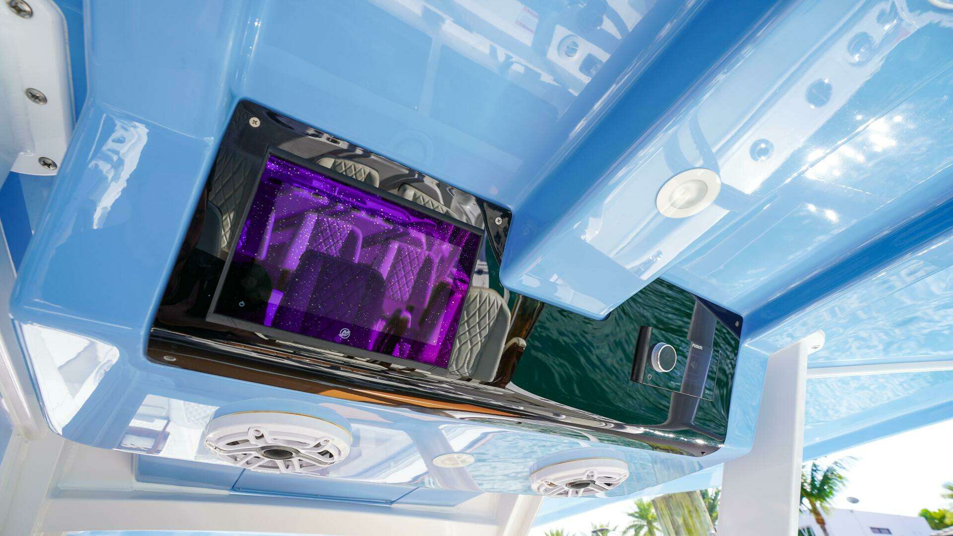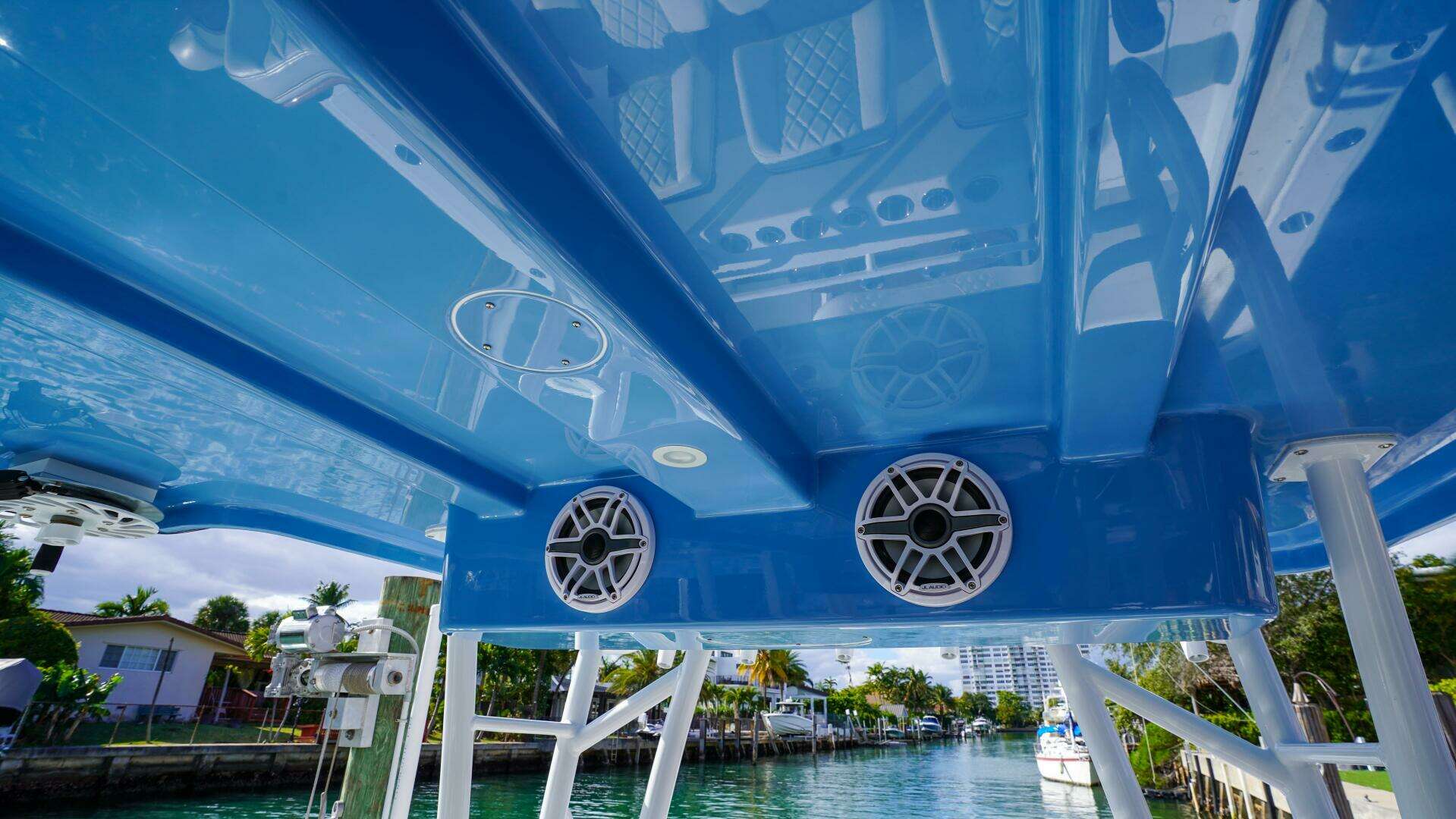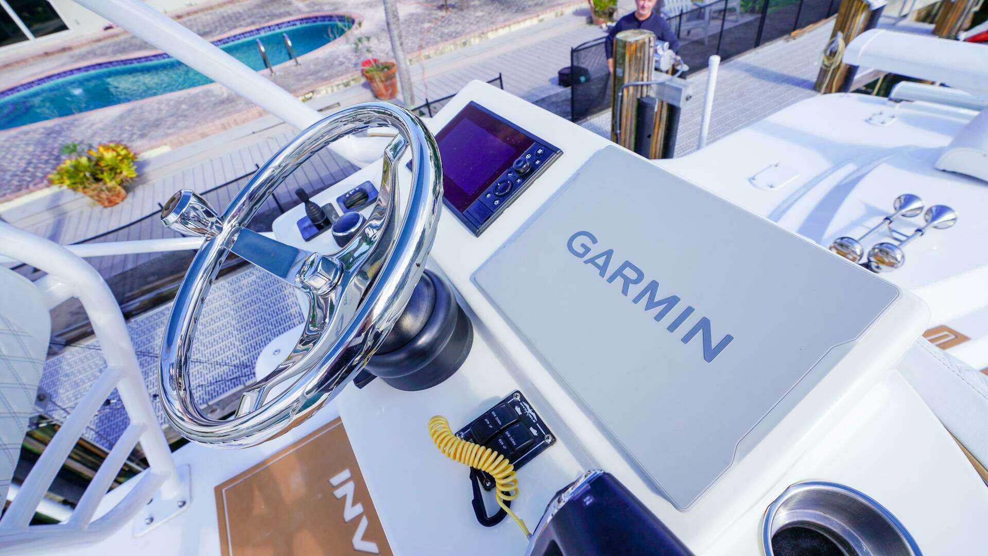 Above the helm, the custom hardtop and tower configuration sets this Invincible 43 apart. The extended pilothouse-style hardtop with rear support includes LED spreader lights, kingfish rod holders, rocket launcher reinforcement, Gem Blue outrigger bases with 22-foot internal white poles, and multiple rod storage options. The second station is fully equipped with its own Garmin display, VHF command mic, windlass and bow thruster controls, offering excellent visibility when running offshore, spotting fish, or docking.