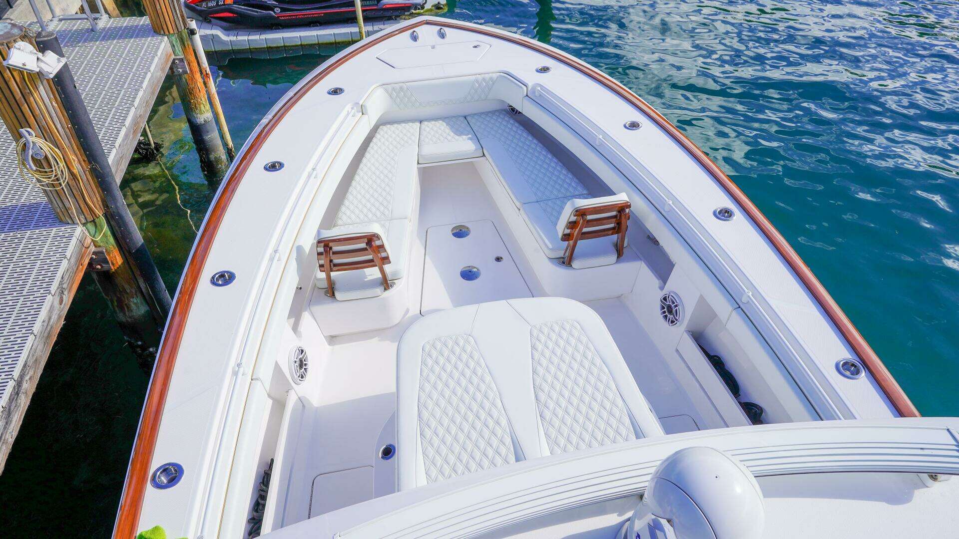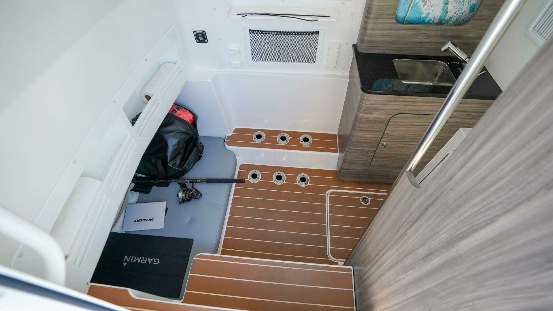 Moving forward to the console interior, the boat reveals a surprisingly spacious and luxurious retreat. The extended console features a deluxe electric head, vanity with sink, ample storage, and plush diamond-stitched cushions, making it ideal for extended day trips or family cruising. The upgraded battery system, charger with galvanic isolator, and engine flushing system are all neatly integrated for reliability and ease of ownership.