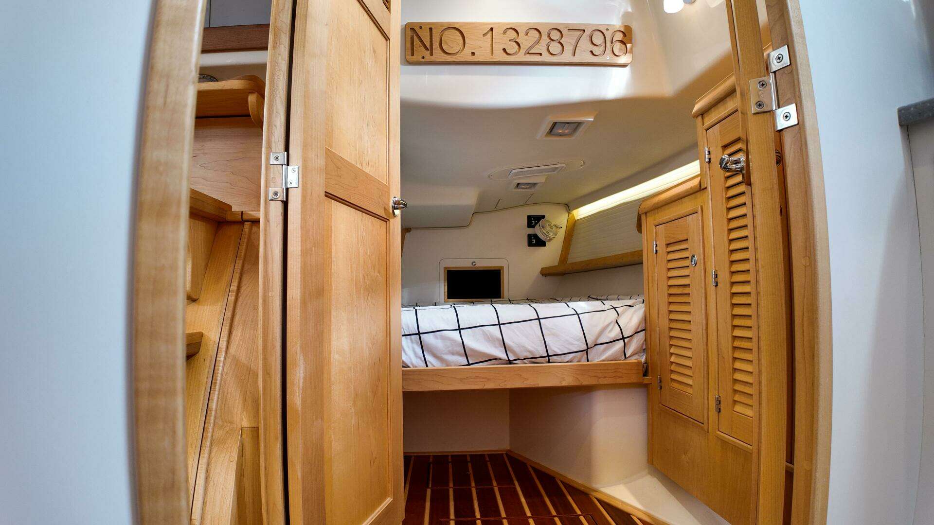 - Offset island berth with queen-size innerspring mattress (7 ½" pillow-top, tall coil) and storage beneath