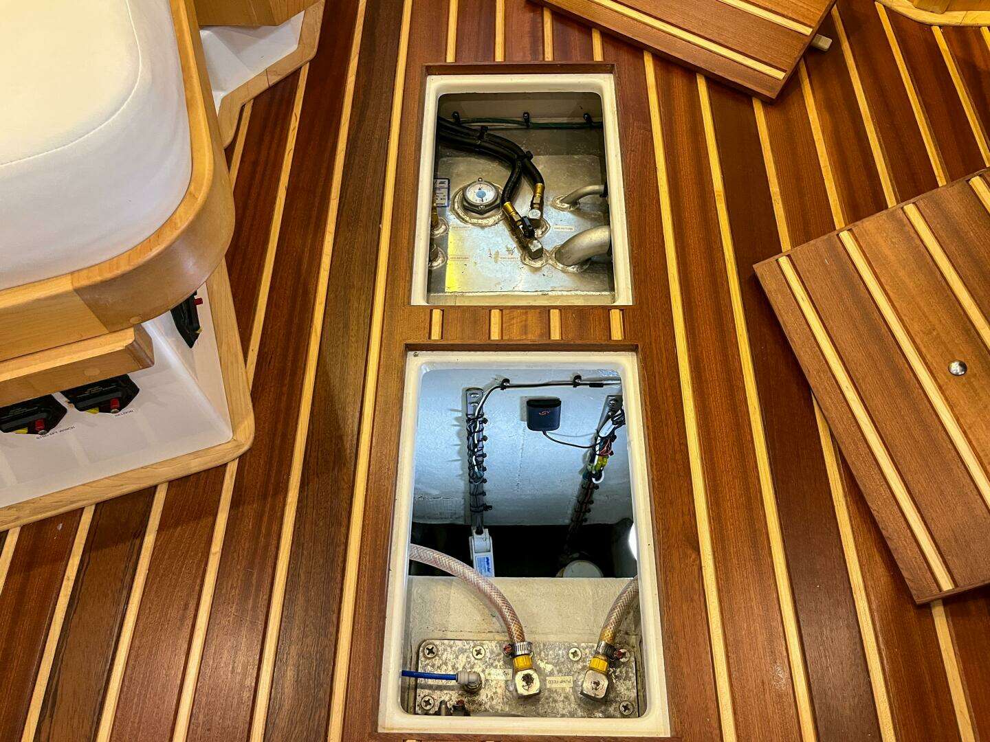 - Sapele grate at companionway base lifts for bilge access and removable dust pan