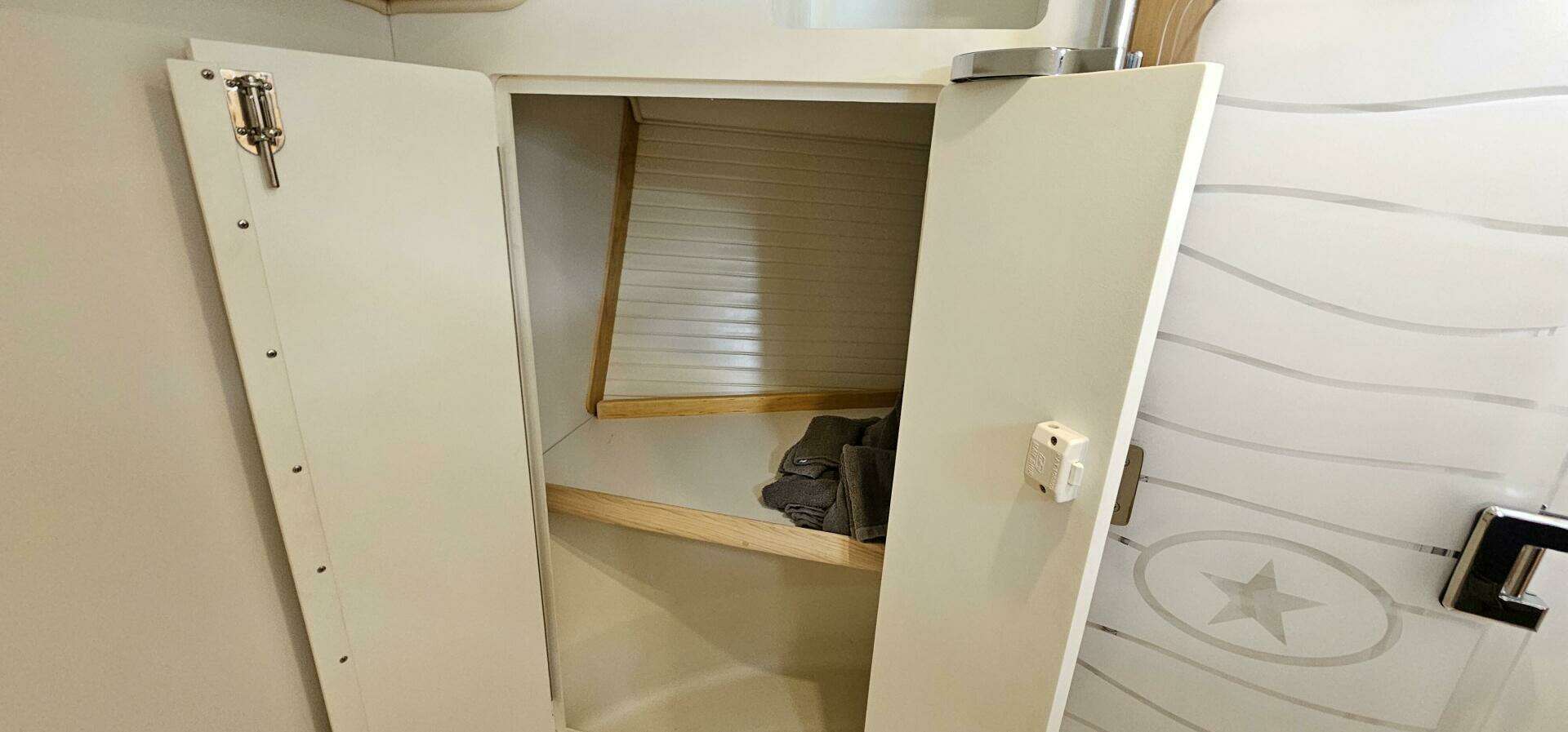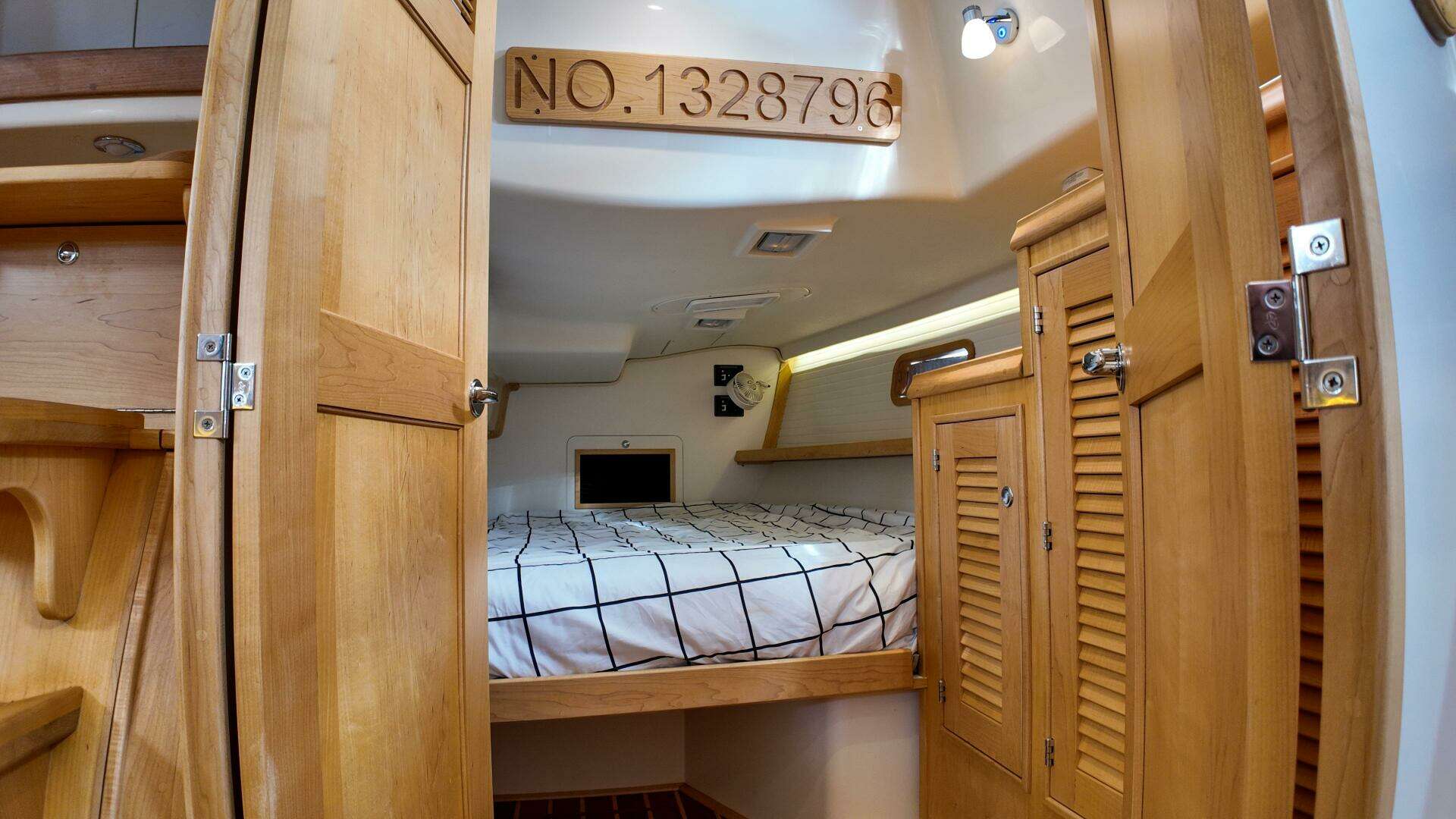 - Starboard side: settee with generous storage behind/below and lockable drawer for ship’s papers; converts to double berth