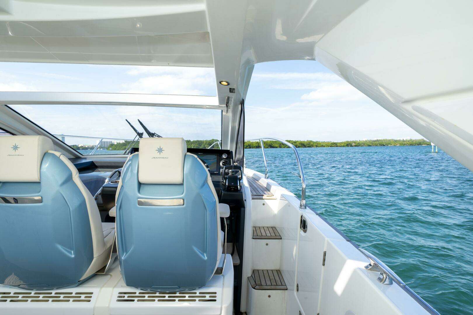 - Helm station equipped with advanced electronics, joystick control, and side door access for convenience.