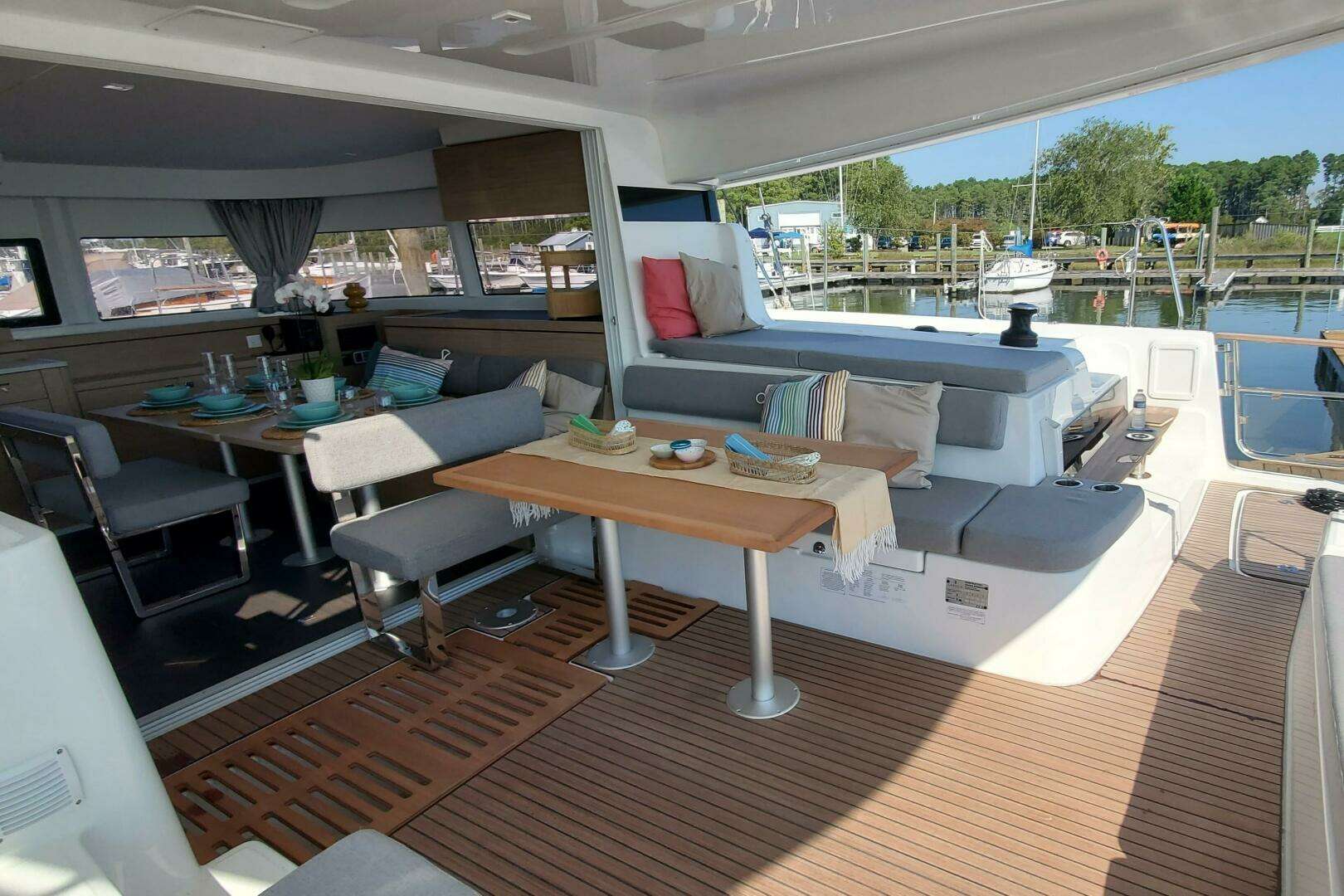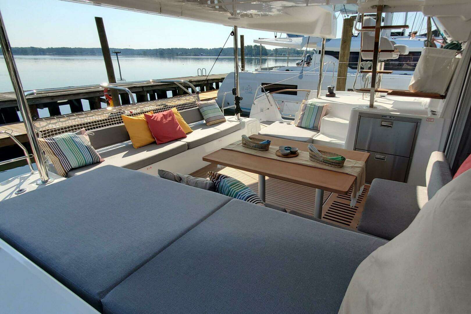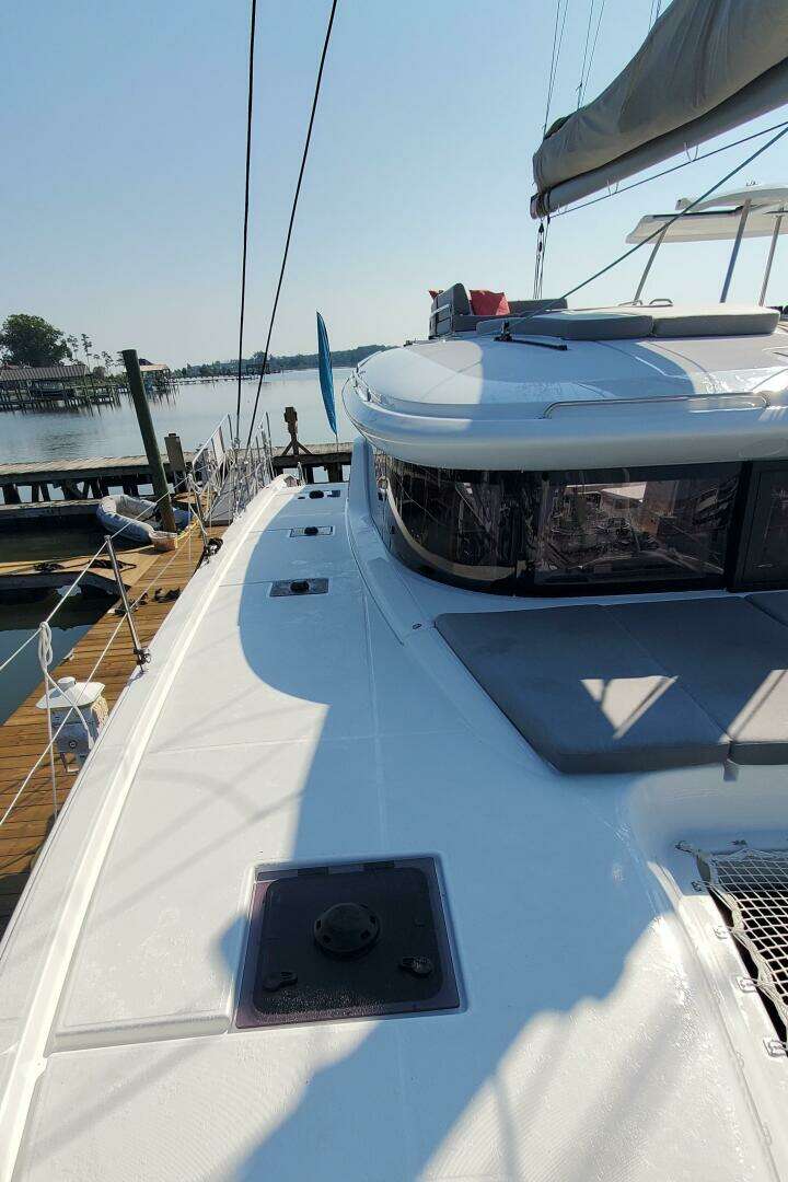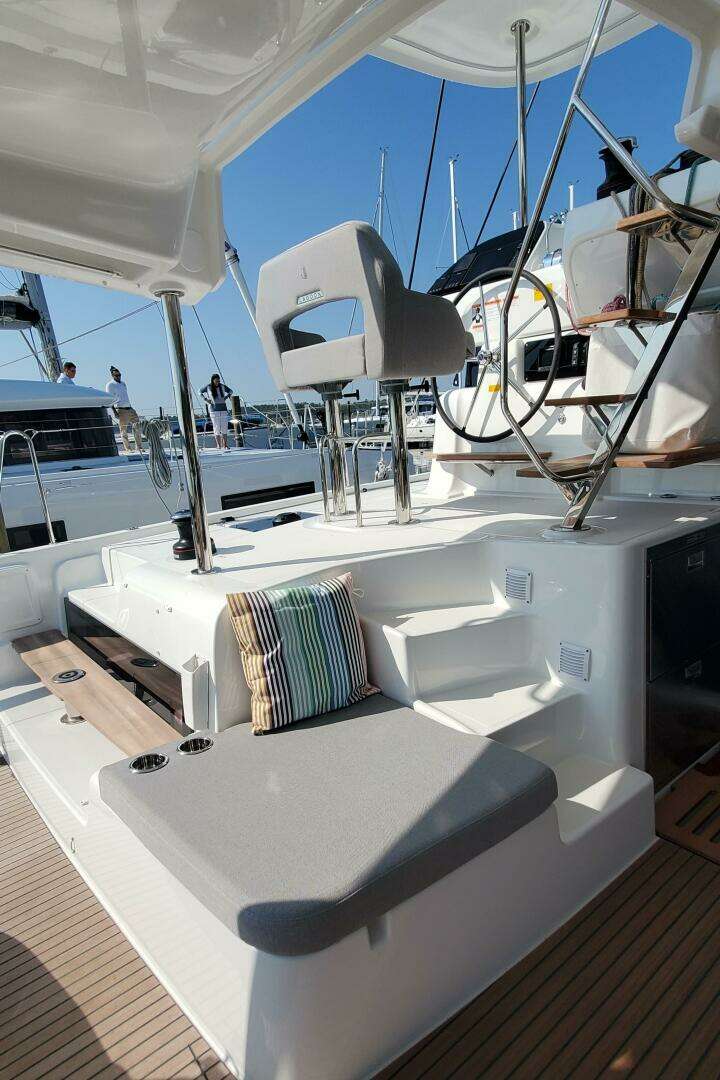 It now includes an additional aft entryway for each hull. This new feature improves access between the boat and the dock, enhancing both comfort and safety. This access point is integrated into the catamaran's design, preserving its aesthetic while offering practical benefits. This innovation sets a new standard in yacht design, prioritizing convenience and elegance.