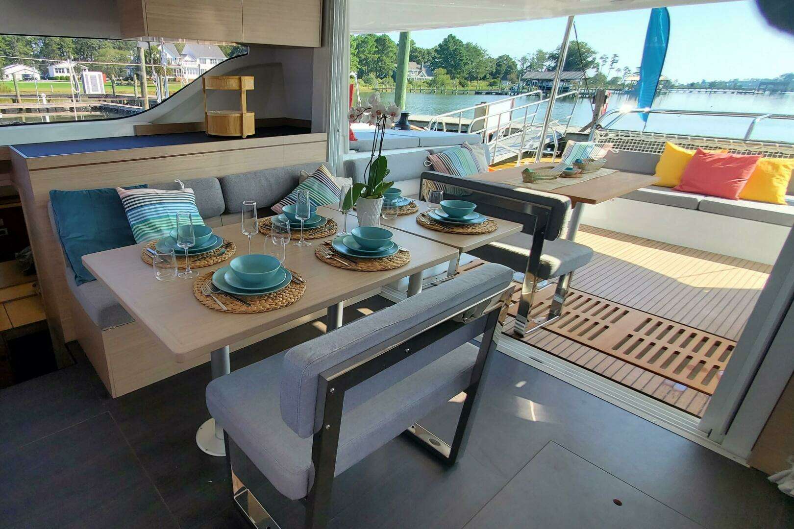 Lagoon has redefined onboard living with a highly adaptable catamaran, featuring modular spaces. This innovative design allows you to easily transform the layout, merging the interior and exterior, and the saloon and cockpit, according to your preferences. The design enables various configurations, including a dining area that seats up to 12 guests.