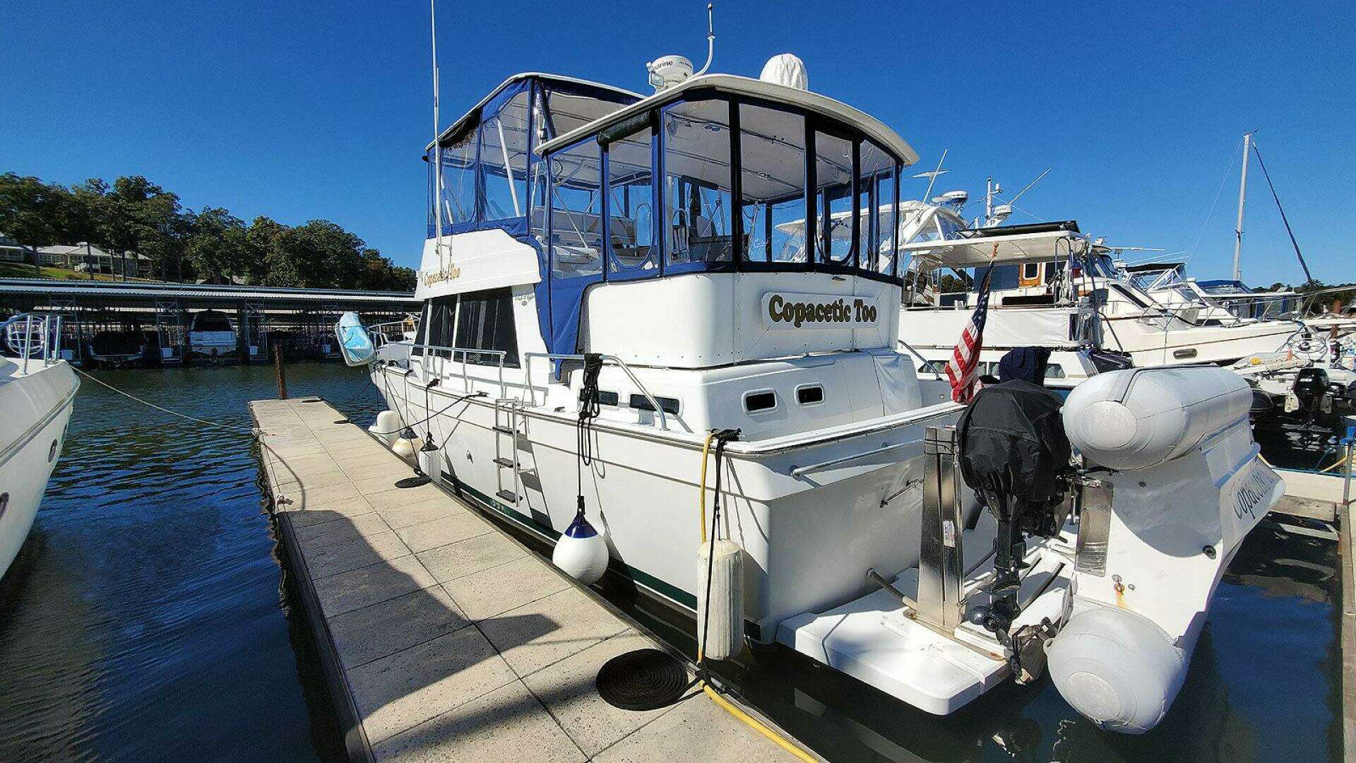 Copacetic Too is a 2001 Mainship 430 Aft Cabin Trawler featuring a two-stateroom, two-head layout and presented in exceptional condition. She has been meticulously maintained and thoughtfully upgraded throughout her life. Powered by twin Cummins 330 HP engines and supported by a Kohler 8 kW generator, she also includes an oil change system, dripless shaft seals, a Walker Bay inflatable tender, and a Sea Wise tender davit system.