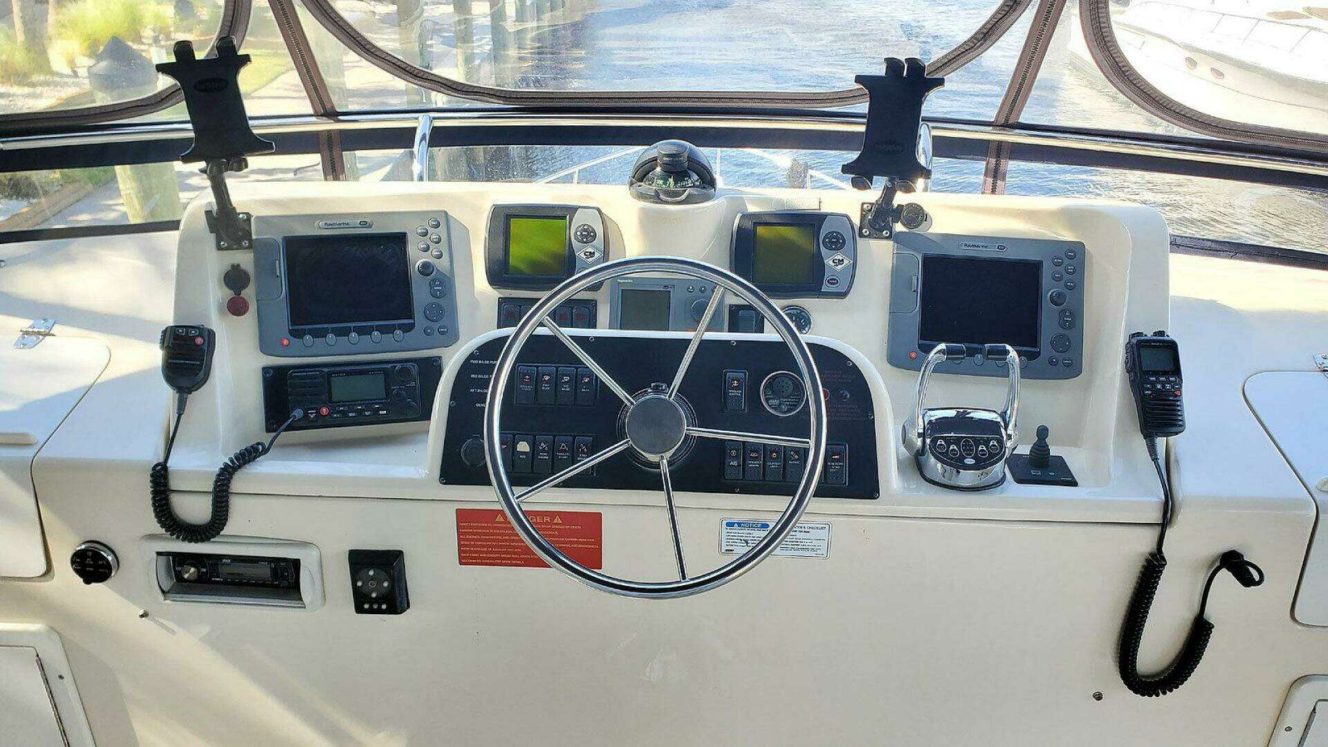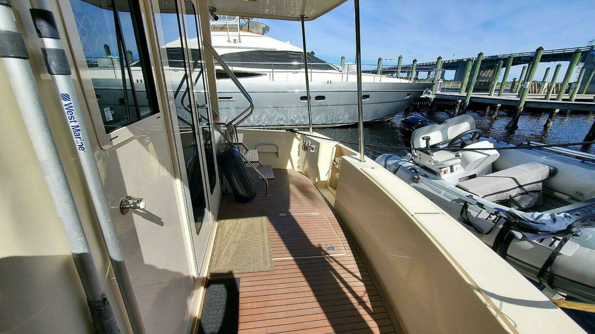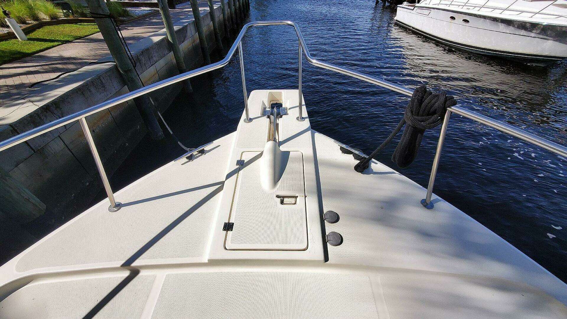 - Non-skid decks on the bow, flybridge, and side walkways, with synthetic teak and holly decking in the cockpit