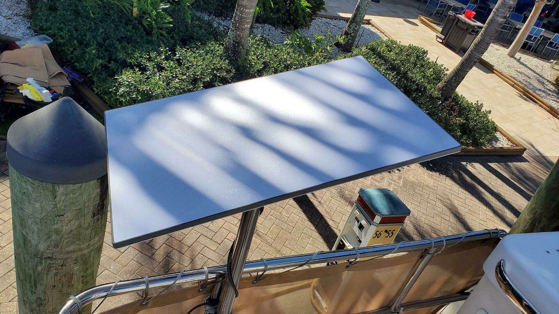 The upper aft deck includes a summer kitchen with storage, a sink, a U-Line icemaker, a Kenyon electric BBQ grill, a non-skid deck, and a hinged radar mast.