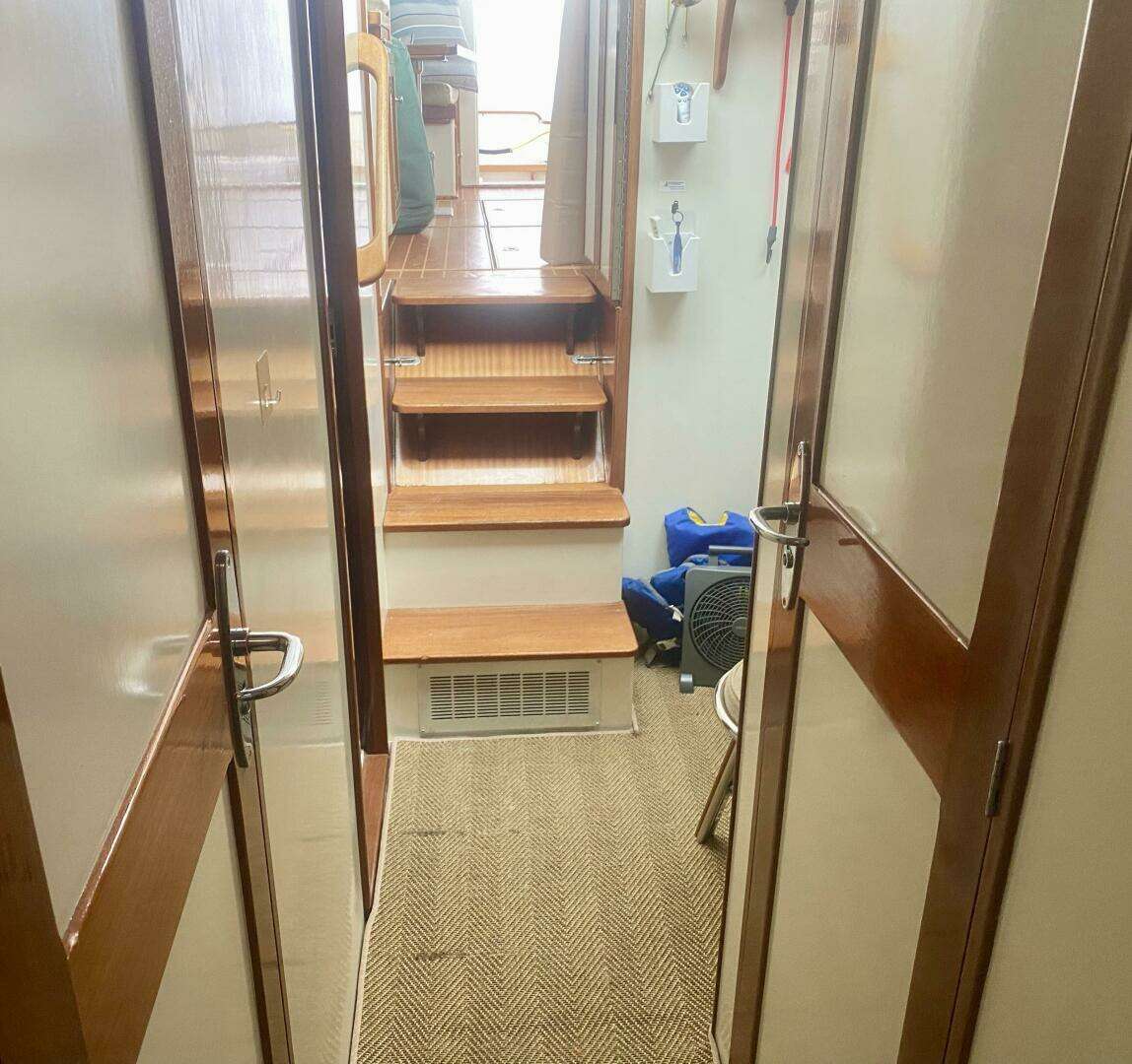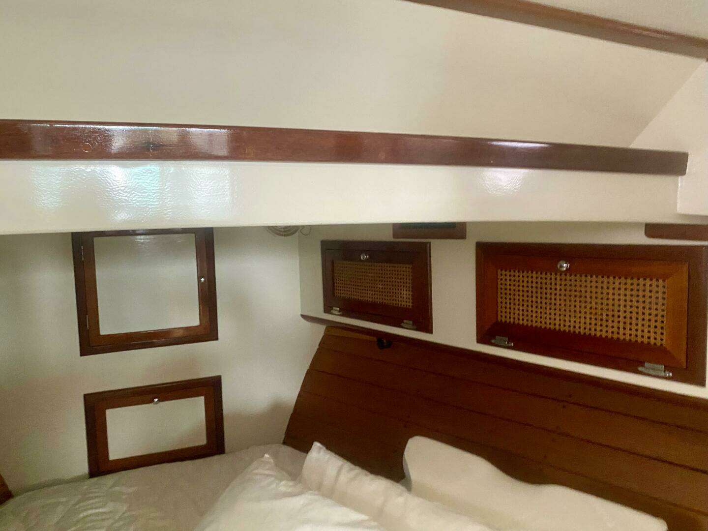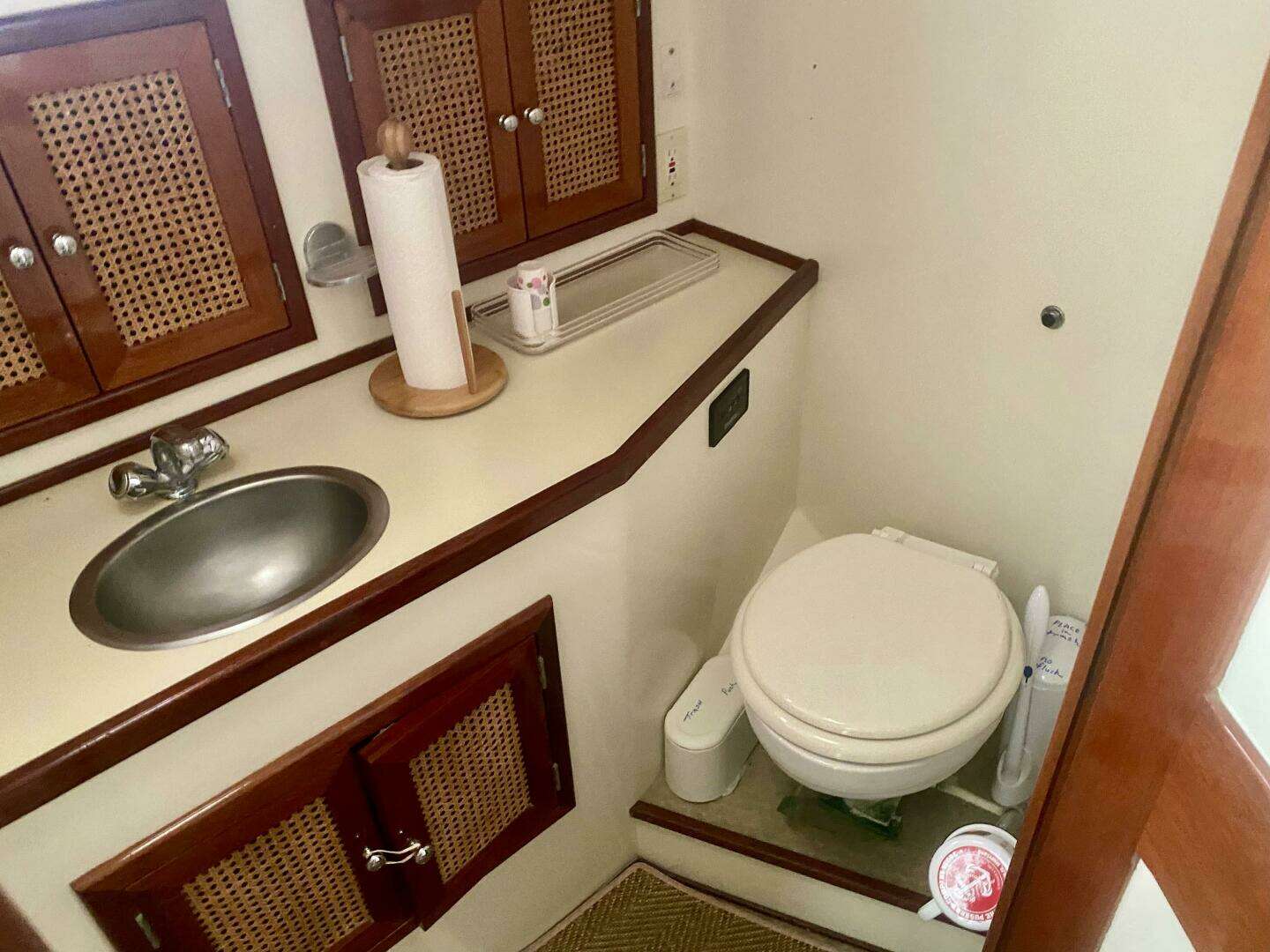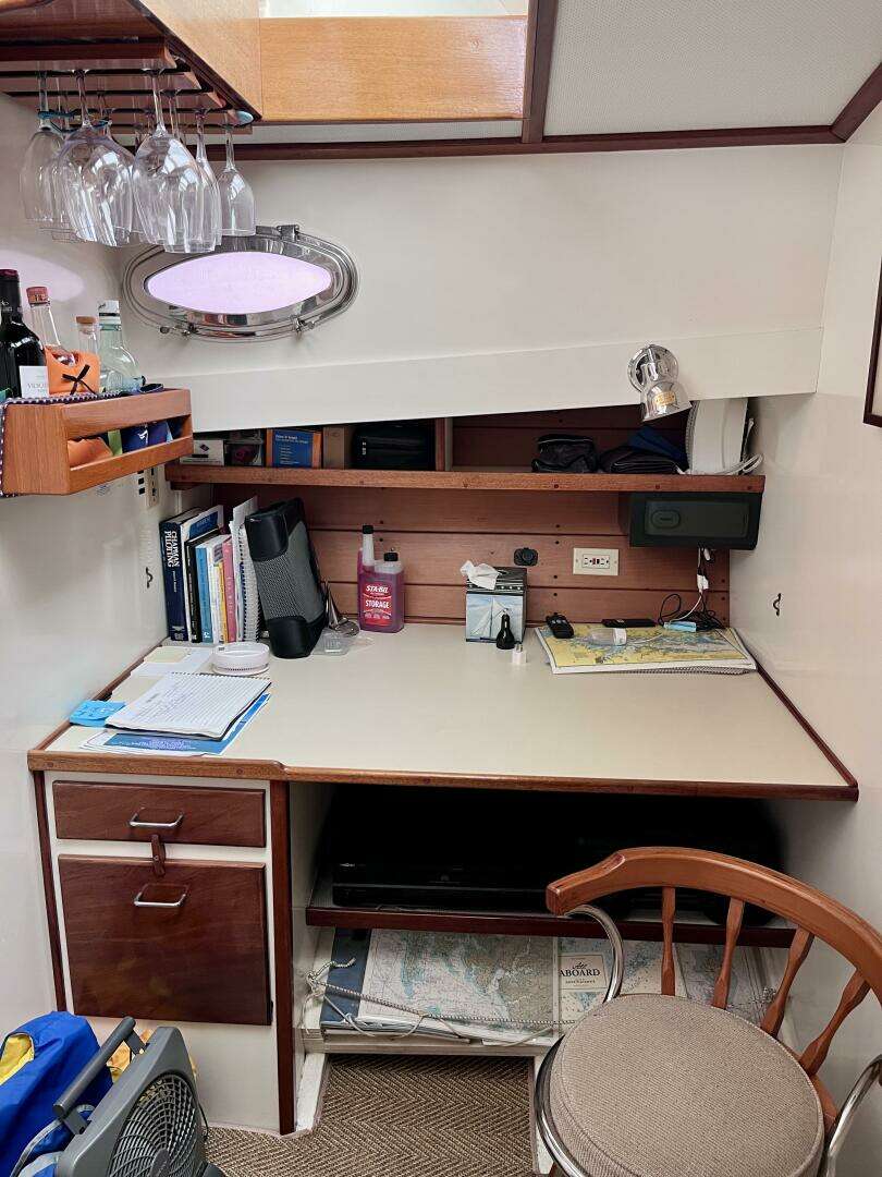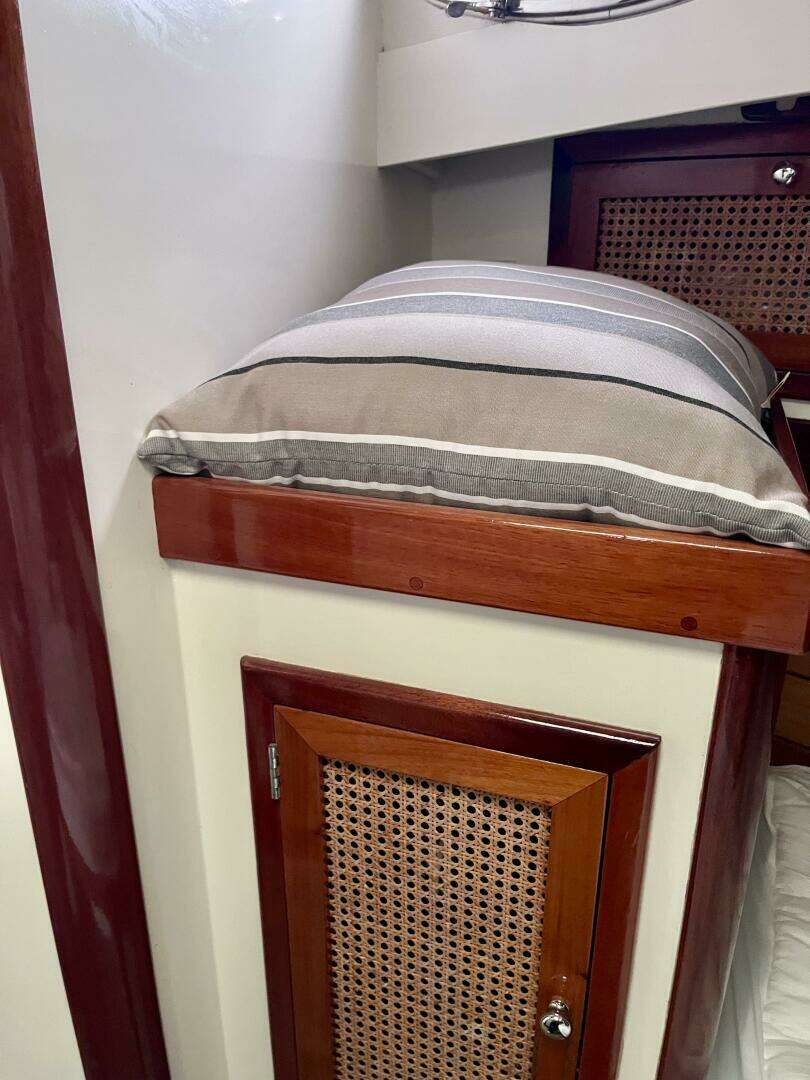 The entire boat is air conditioned, including the head. Forward and down two steps is a separate office/study area with built-in desk, to port. A comfortable guest stateroom with a single berth is to starboard. The roomy head is just forward to port, and an equally roomy separate stall shower is to starboard. It is a tremendous advantage to have the head and shower separate as both can be occupied at once. Forward is the master stateroom, with plenty of headroom and featuring a large V-berth with custom mattress, hanging lockers and storage above and below.