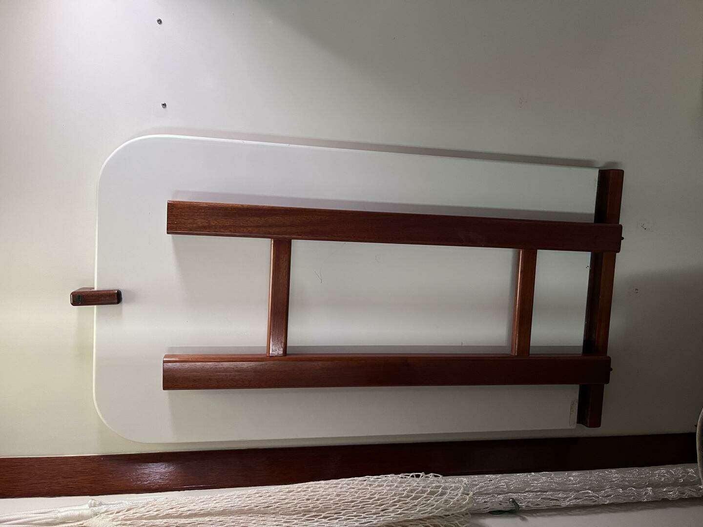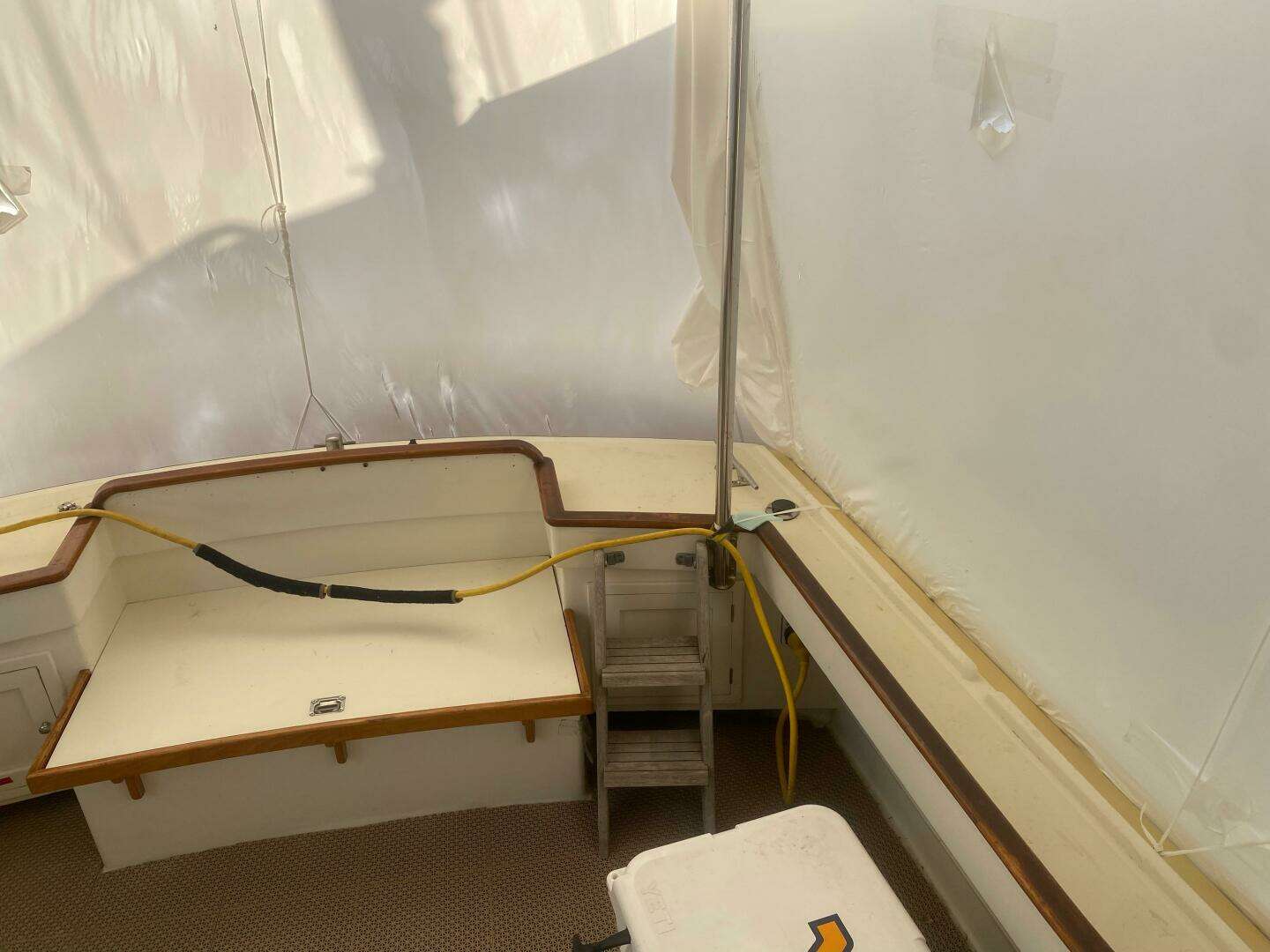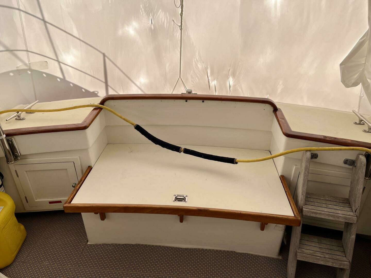 Outside, the large cockpit has built-in seating for five and room for extra chairs and a table. There is abundant storage for cruising gear and supplies and easy access to the rudder post and spare prop. A hardtop extension was added by the original builder in 2006, and a complete canvas/plastic window enclosure provides protection during inclement weather. A small set of steps mounts on either side of the gunnel, and another on the transom, for ease of boarding.