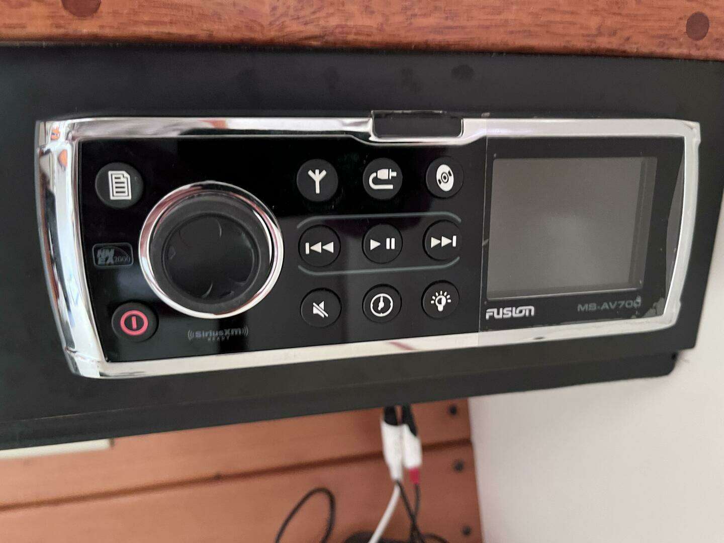 The helm station, adjacent to the galley, features a double helm seat and is equipped with an Raymarine Hybrid Touch multidisplay GPS/chartplotter, SIMRAD autopilot and wind instruments, Icom VHF and 8" Perko remote control spotlight. A new bow thruster (updated 2025) makes maneuvering with the single screw easy. The helm controls, along with instruments/displays, trim tabs, bow thruster and windlass controls are neatly laid out for the helmsman. Just adjacent to the helm are the covered and organized 12v and 110v electrical panels.
