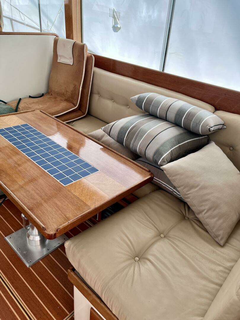 Her galley-up layout features a 3-burner LPG stove top, microwave-convection oven, 1 undercounter Frigoboat DC with front door and a top load independent Frigoboat freezer, hand laid ceramic tile counter tops. A comfortable L-shaped settee and dinette table converts to a double berth when desired.