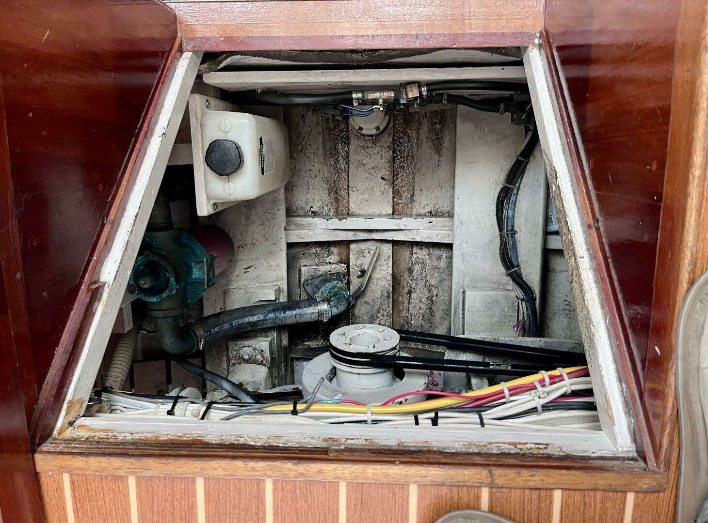 The shaft is totally enclosed by the full-length keel, and the prop is protected by a stainless steel shoe attached to the bottom of the keel. The shaft has been fitted with line cutters. A spare prop is included and stowed in the aft lazarette. Steering is hydraulic, and the wheel is a destroyer type finished with a suede leather material.