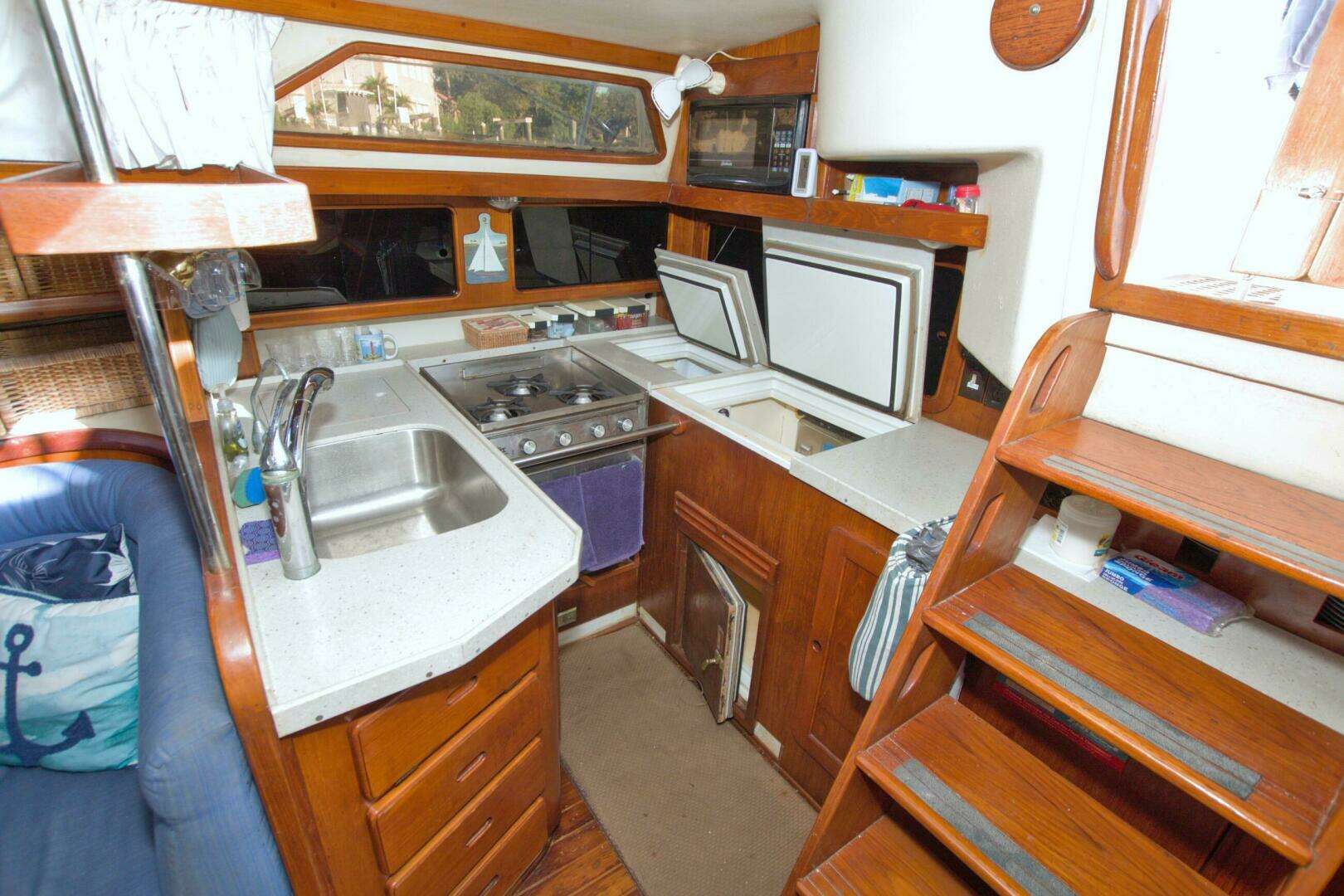 The forward cabin has V-berth with hanging locker and head. Main Salon has two comfortable lounge chairs with common table and a large settee to starboard with centerline drop-leaf table. The table has been designed with additional storage inside. Galley is next aft to starboard and is equipped with deep single sink, CSI 3 burner CNG stove with oven and microwave. Isotherm refrigeration with two-speed compressor and digital temperature readout/control and separate freezer compartment with its own compressor. A Nav Station with seat is to port. A portside hallway leads aft with access to the engine room and Owners Cabin. Owner’s cabin has Full Island berth, hanging locker, and private head with tub/shower. The center cockpit is roomy with an enclosed hardtop with lots of locker storage. The side decks are wide and provide easy access forward and aft. There is a custom aft equipment arch on the stern of the boat that also serves as a dinghy davit.