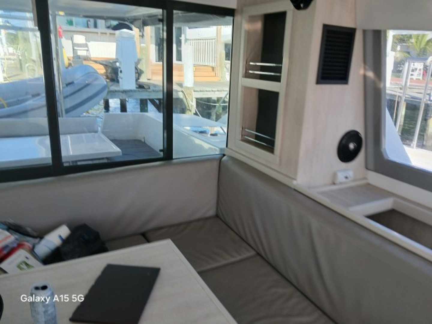 Fusion 700i series marine stereo in saloon with docking station, includes bluetooth, USB, and & AUX connectivity, 2 x speakers in saloon, in aft cockpit, on flybridge & on forward deck, and wired remote control at helm station (1)