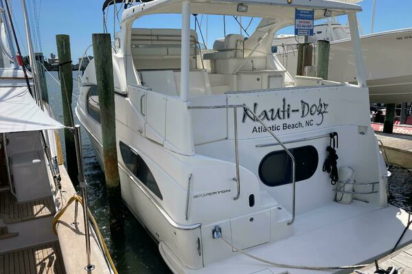 The 43 Silverton Motor Yacht is really aimed towards folks looking for the condo - style accommodations. She is a big boat for her length and offer her owner a great layout with 2 staterooms both with Queen berths with ensuite heads. Both heads are split to separate the shower from the toilets. Her interior has that rich warm feel as soon as you walk in. You can't help but notice the beautiful teak accents throughout. There is also a well-appointed aft deck with a curved stairway leading to a nice sized swim platform. Top side, the helm is forward of the flybridge and offers plenty of great seating for the entire group just aft. Nauti-Dogz is a one owner boat that is seriously for sale. If you are looking for a well-appointed, great live aboard Motor Yacht that won't break the bank.