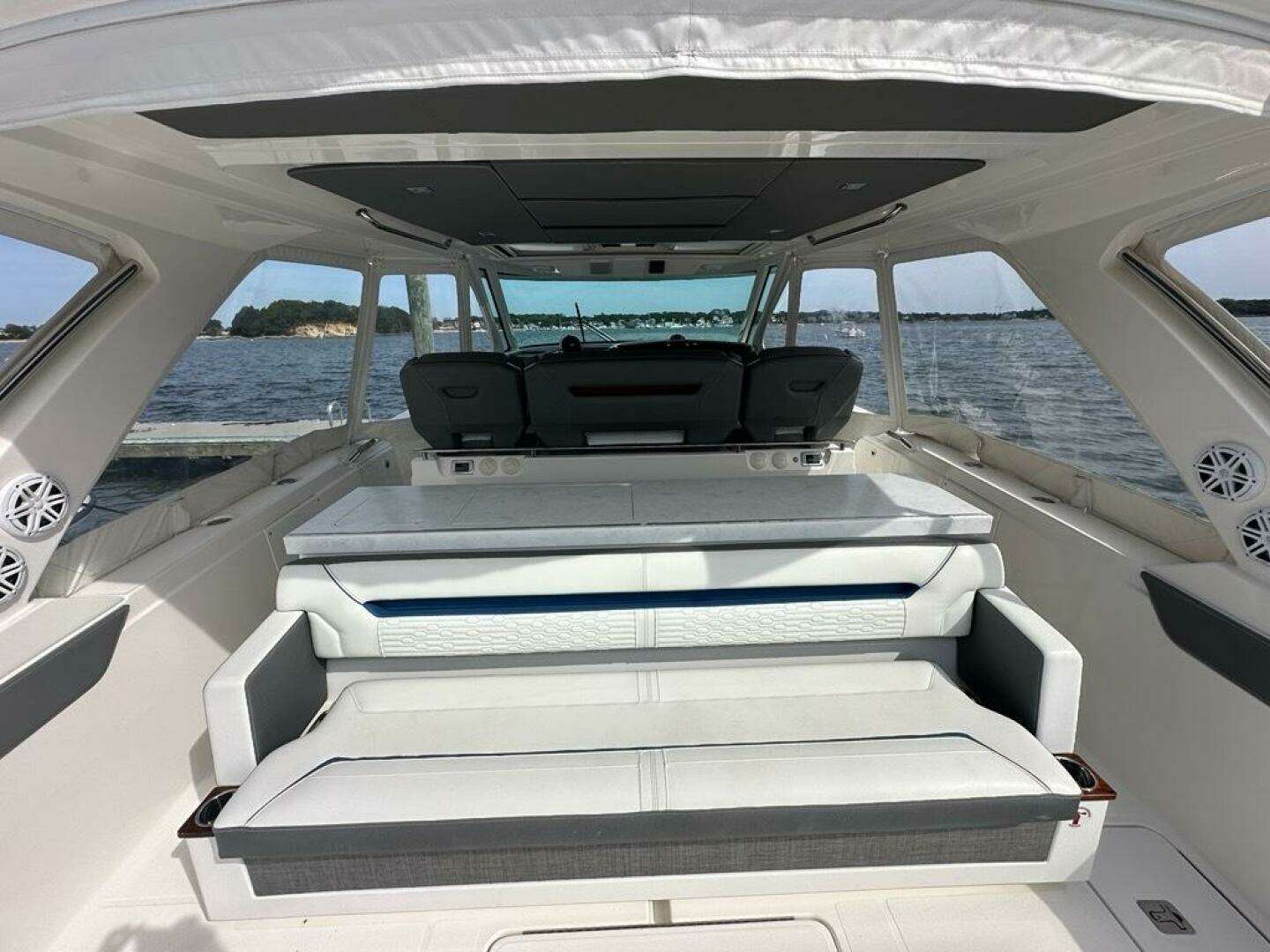 - Double Width Helm Seat on Centerline with Electrically Actuated Fore and Aft Adjustment, Flip-Up Bolster and Weather Cover