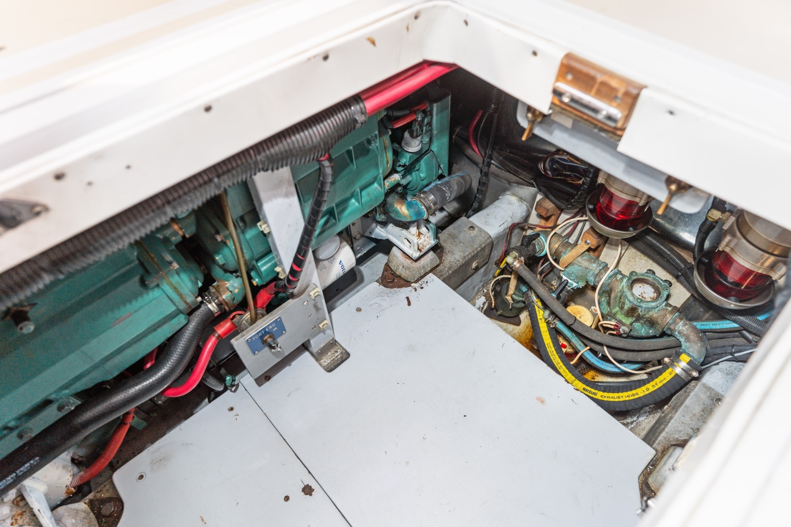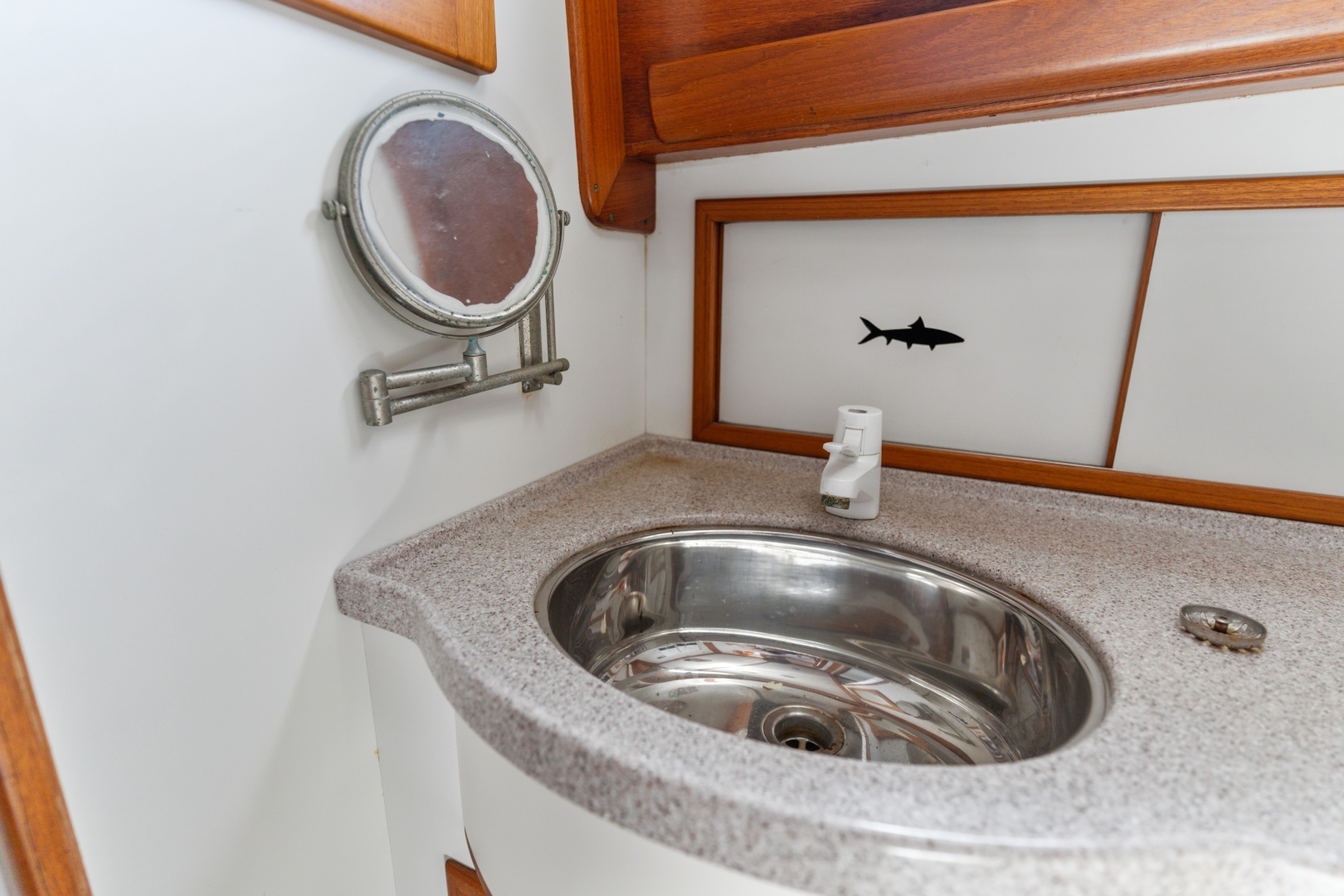 Aft to port is a berth over a convertible settee and cabinetry containing a Blaupunkt cassette/8 CD changer with speakersthroughout the vessel. A Sony television, is also located here, with VCR on a moveable base to allow viewing from anywhere in thesalon. Under this cabinet are two very large storage drawers. Further aft is a very large head with separate oversized shower withseat, and more than ample storage. The head system is Vacuflush. The shower and head have custom cabinetry and whitecomposite bulkheads trimmed in teak with a satin finish. The countertops are Corian, the sink is polished stainless and the fixturesare FM Mattson. There is a port light and overhead lighting as well.