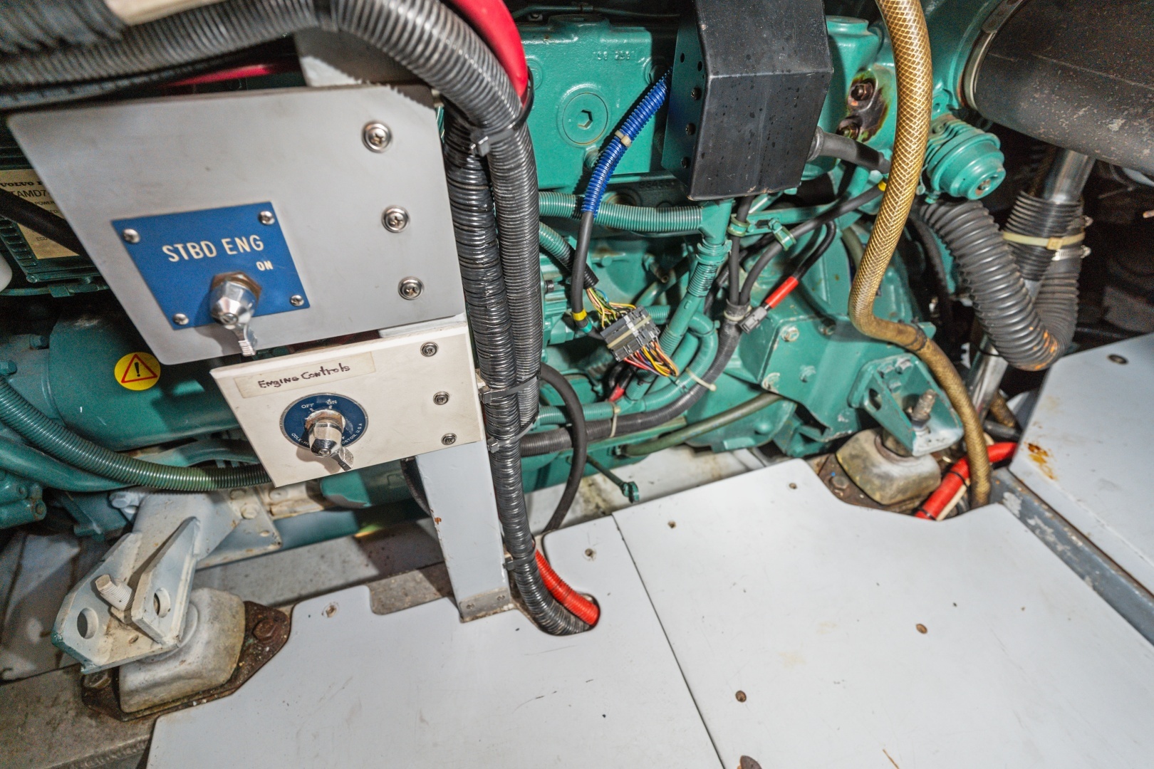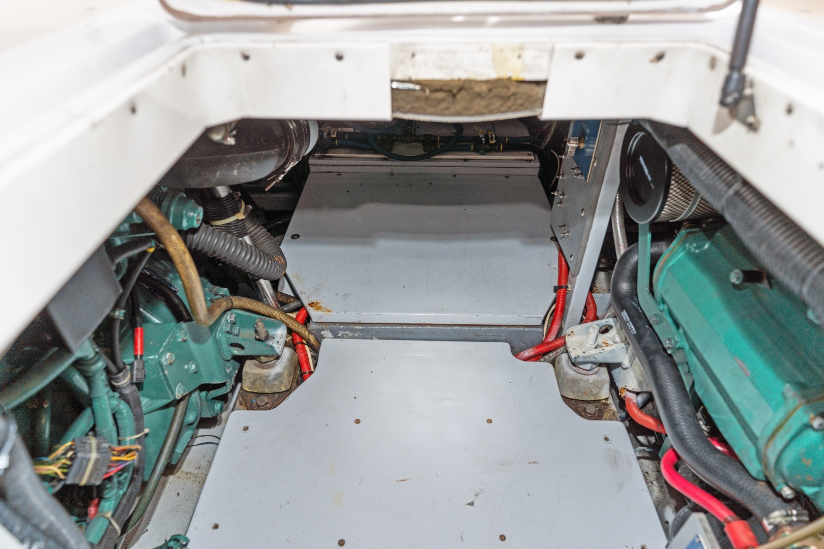 On the starboard side is the helm console of mahogany with a 6" Ritchie power damp compass, a FURUNO FCV 667 color videosounder, Robertson A20 autopilot, a Northstar 6000 DGPS charts system and a Furuno 48 mile radar. The Volvo single leverelectronic controls, Bennett trim tabs, engine gauges and windshield wiper panel is below near the steering wheel. Aft of thecustom helm seat is another long settee with storage under. All of the settees have Sunbrella cushions. 2 Bomar overhead hatchesprovide ventilation.