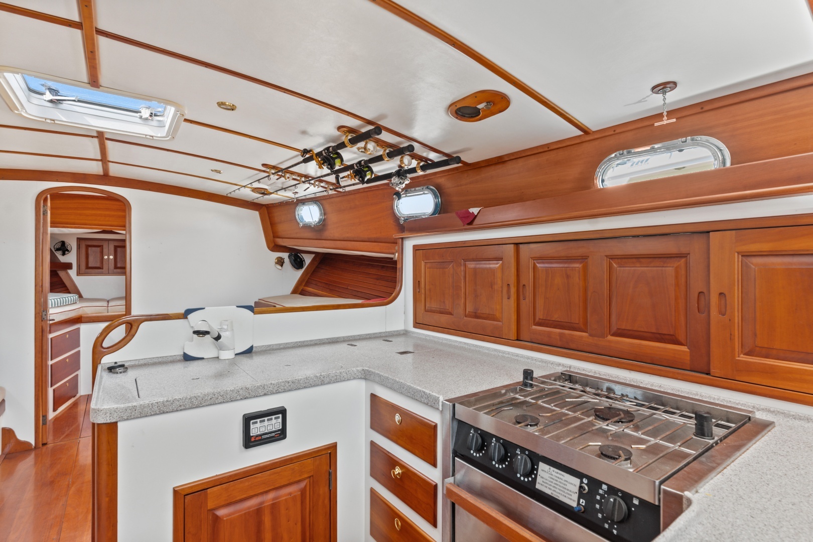 Aft of this is the galley. There is a large amount of storage in a series of sliding lockers. The lockers contain a Panasonicmicrowave oven and a very efficient dish and glass racking system. Below the cabinetry is a very large Corian counter/prep areathat houses a large double polished stainless sink with FM Mattson retractable faucetry, a huge Glacier Bay refrigerator, a GlacierBay freezer and Force 10 marine propane 3 burner stove with sea rails and oven. There are 4 drawers for the galley utensils and ahuge under sink storage locker. There is also a Xintex X2A propane detector sensor with alarm.