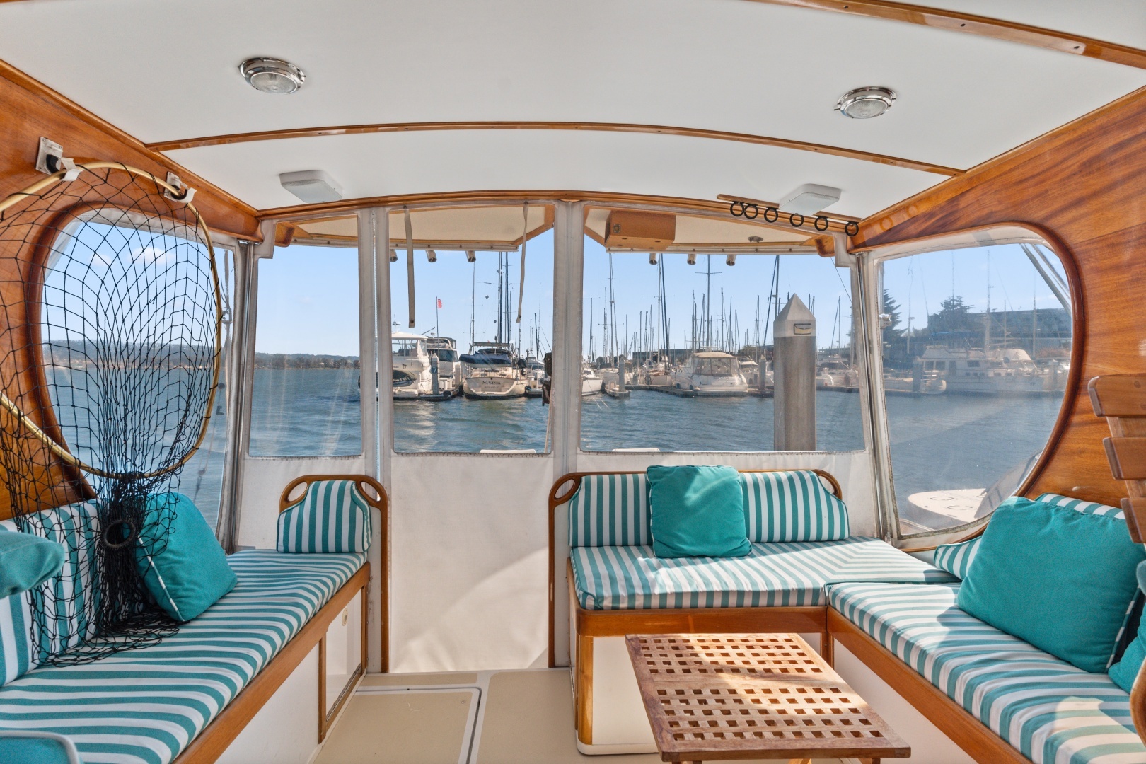 The bridge deck is brightly varnished Honduras Mahogany with exquisite joinery with beautiful grain. There is a large chart tablewith a custom helm seat of mahogany with cushions to port and an L-shaped settee just aft with good storage under.
