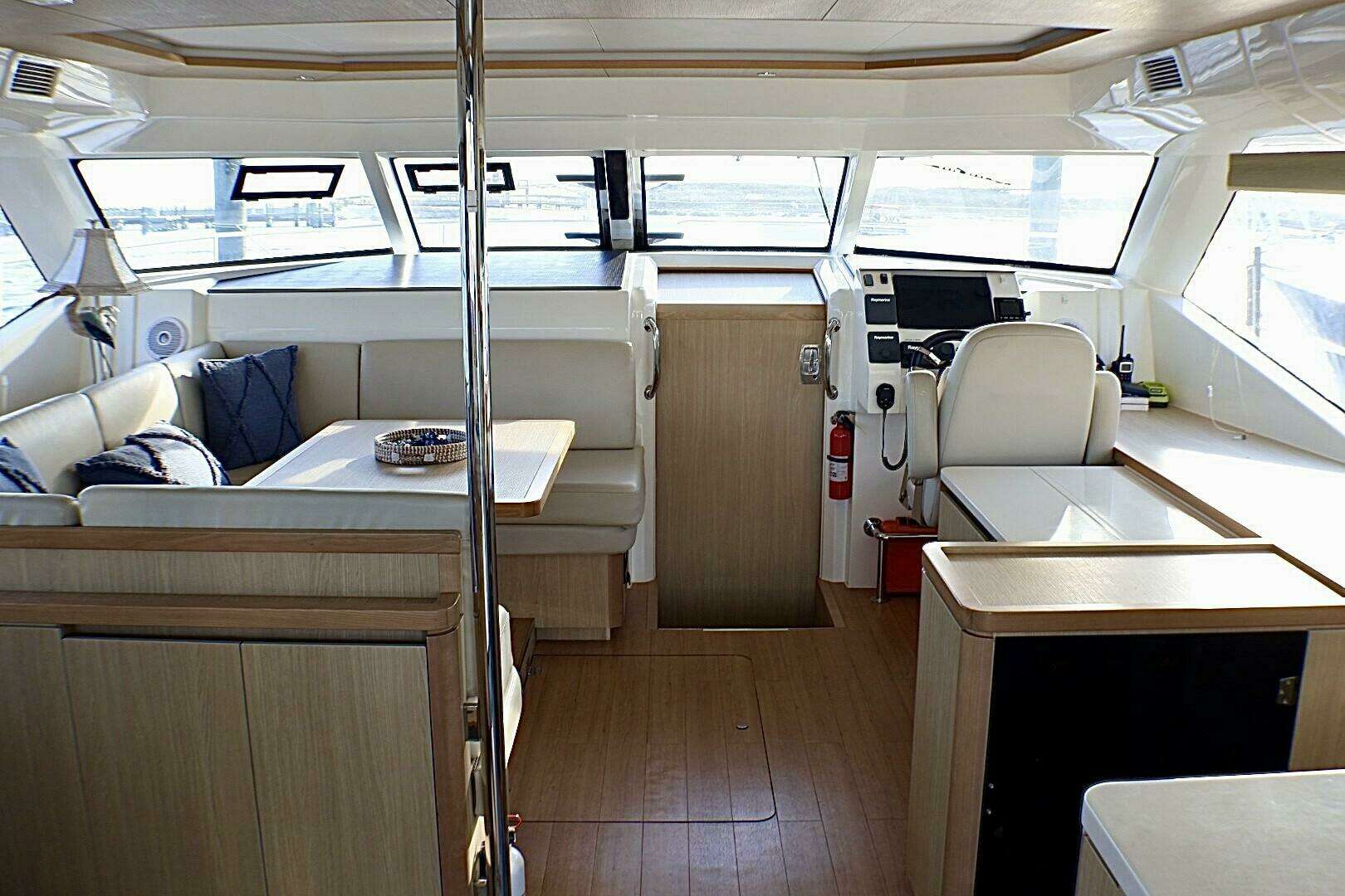 If you have yourself chartered a power cat in the BVI or Bahamas, as many catamaran enthusiasts have you might not at first appreciate the second, interior full helm station on Mimi’s Oasis. Why? Because the weather is almost always moderate in the BVI or Bahamas. Neither too hot, nor too cold.