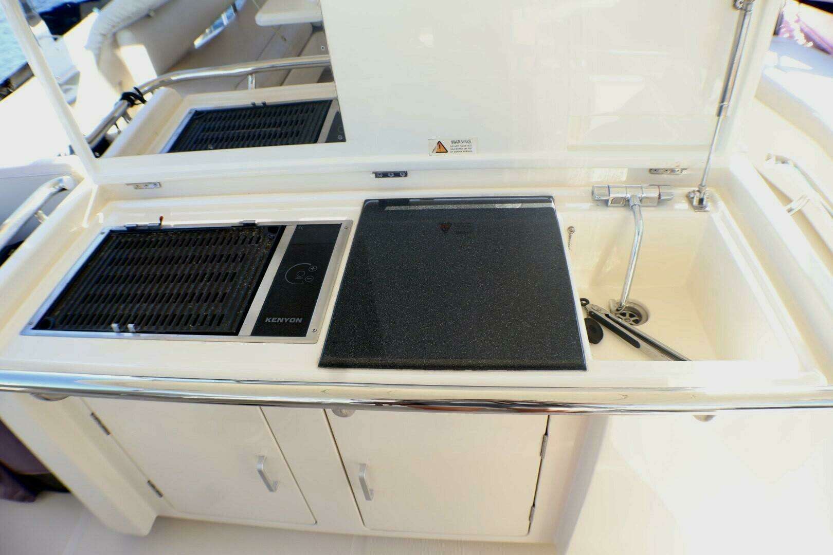 - Integrated hinged fiberglass cover for wet bar area with Flybridge Grill and Fridge 12v
