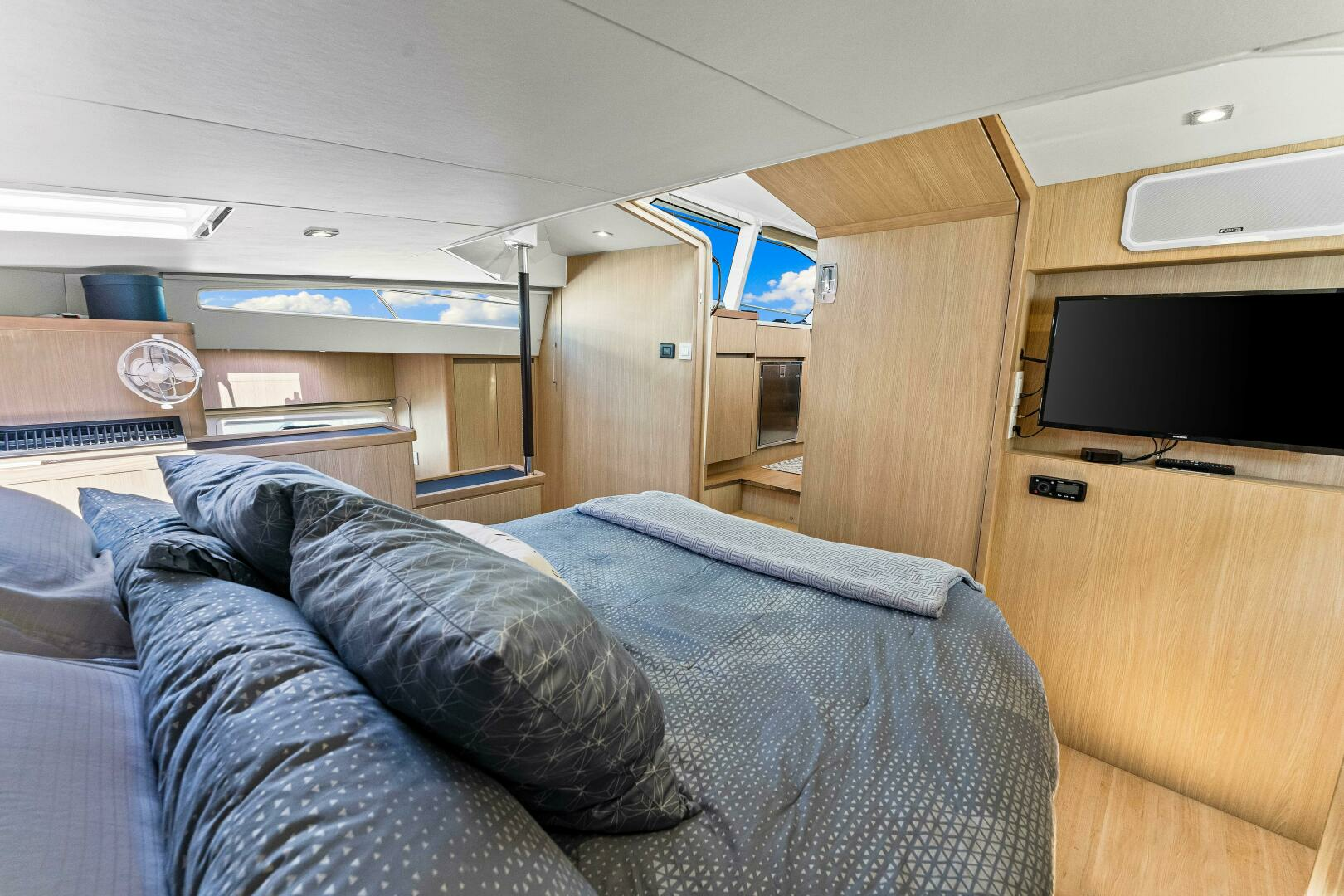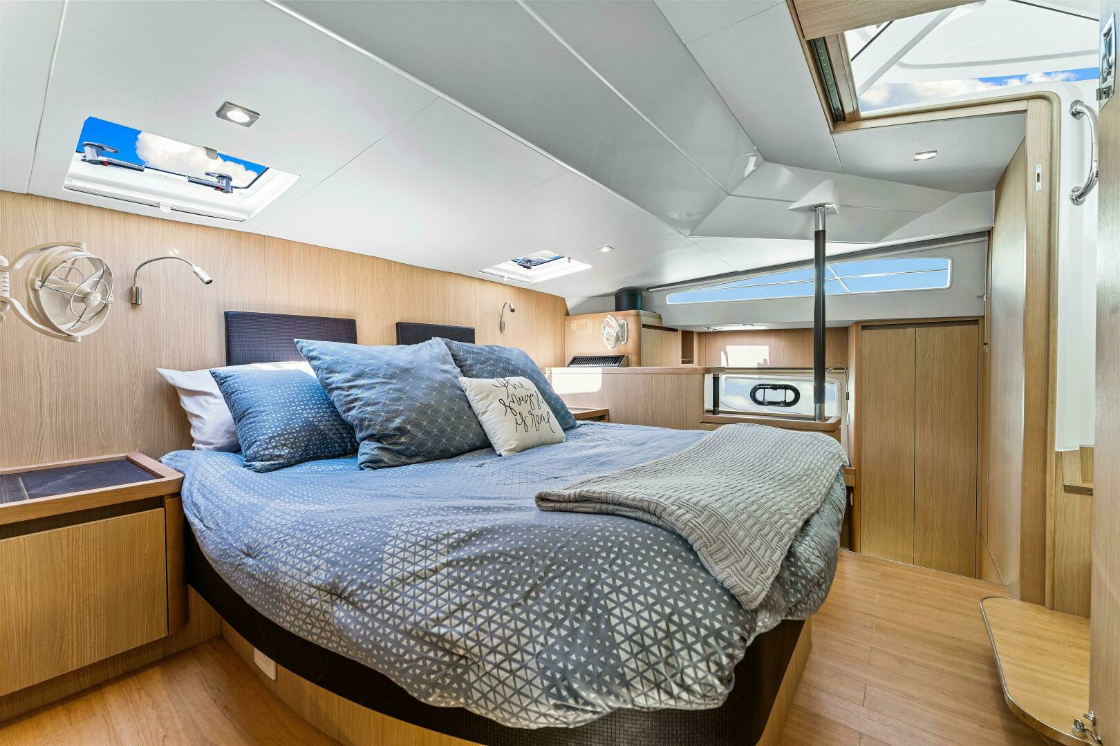 The master stateroom is centerline forward in the Aquila 44. With a walkaround queen bed, full bath as well as an office area with credenza and storage, it's a very comfortable and complete owner's suite.