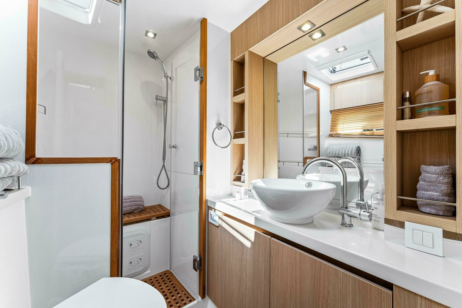 - Large separate shower with seating, teak grate